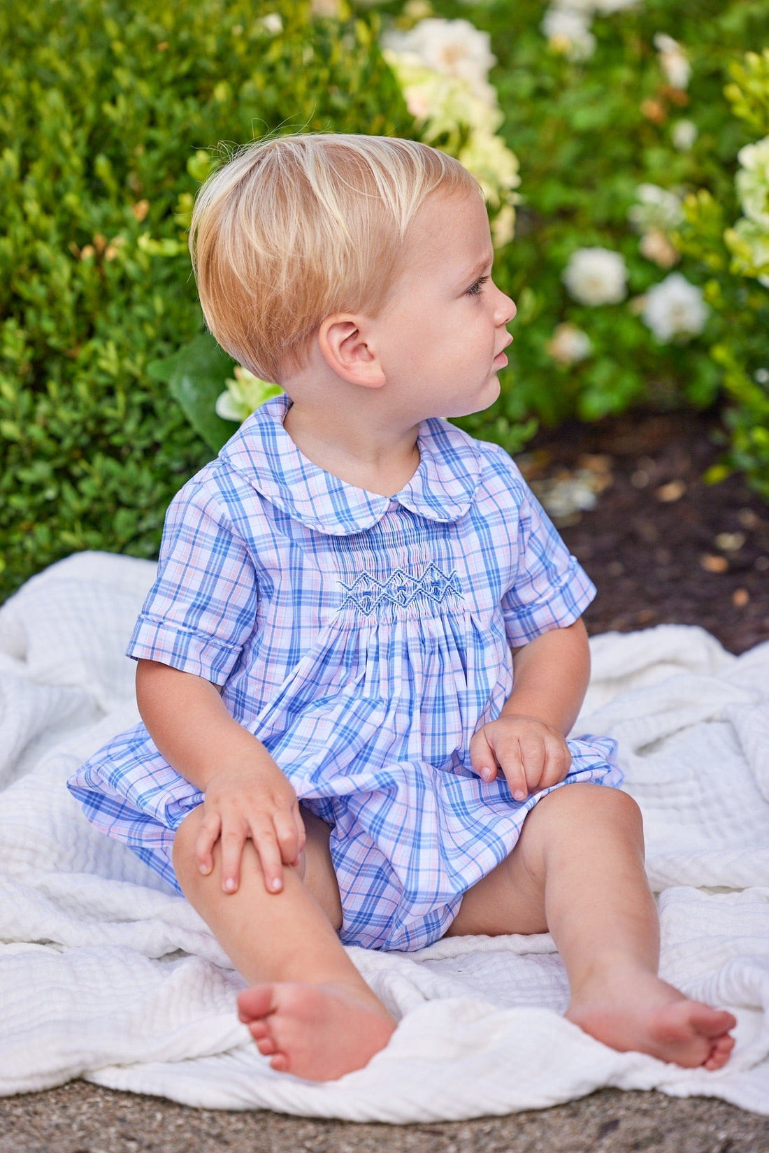 Little English traditional children's clothing. Baby boy smocked peter pan bubble for spring.  Pink, blue, and green plaid bubble, Easter outfit for baby boys