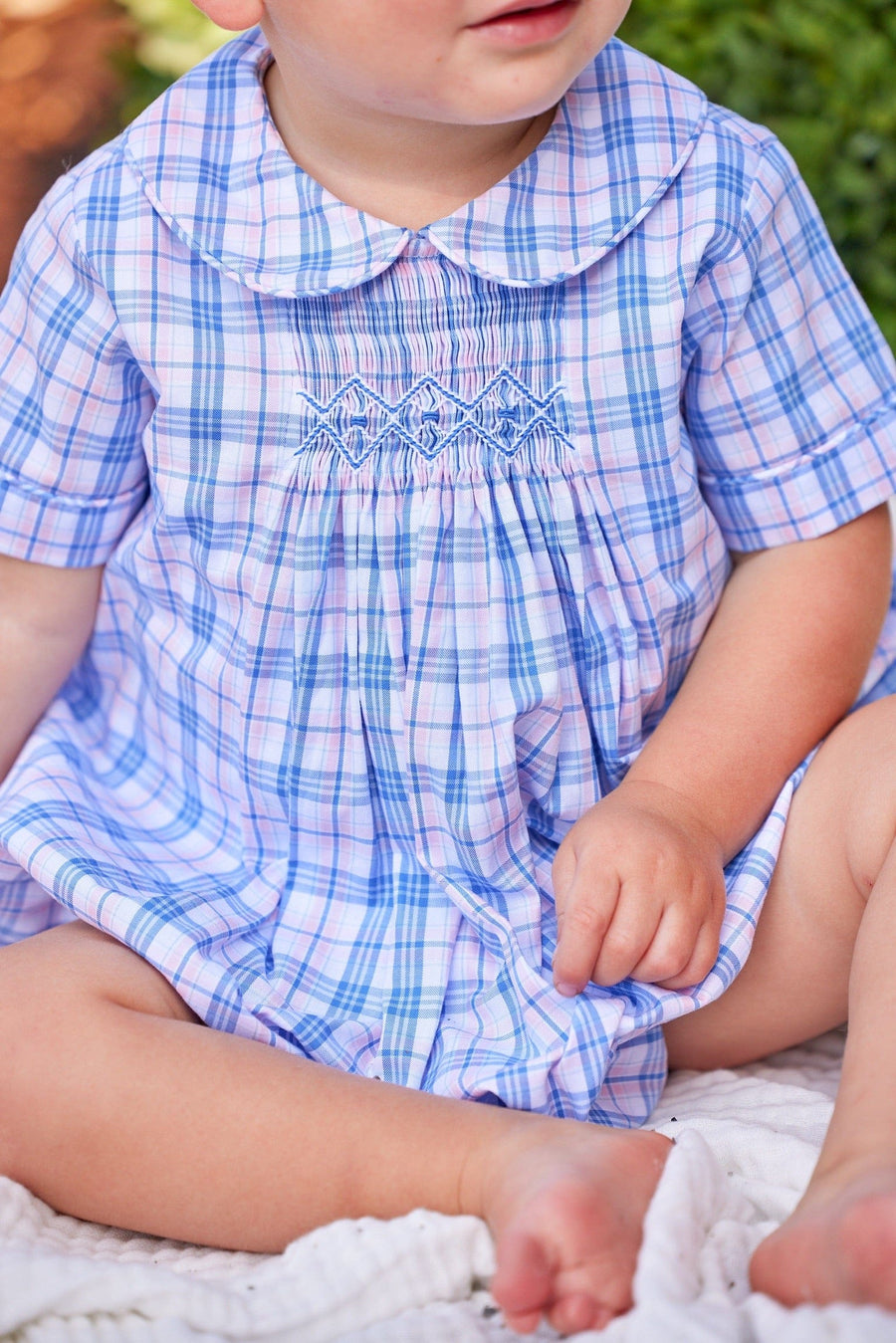 The Albany Plaid is a quintessential plaid that’s perfect for Easter celebrations with pastel pinks, blues, and hints of green. Our Chest Smocked Bubble is a traditional hand-smocked style with beautiful geometric detailing at the center chest. With short sleeves and a peter pan collar, this sweet bubble is just what your baby boy's closet needs. Plus, big brother can coordinate perfectly in our Chest Smocked Short Set.