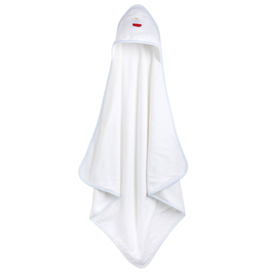 Little English white terry cloth baby towel, hooded towel with embroidered red sailboat and light blue trim