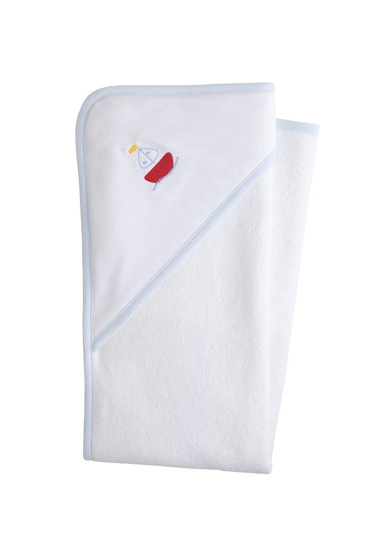 Our Hooded Towels are perfectly sized for your young children. This style features a white hood with an embroidered sailboat and full terry cloth lining with light blue striped binding. They're super soft and great to give as gifts or to treat your own kiddos! Each towel is rolled and tied with a Little English ribbon.