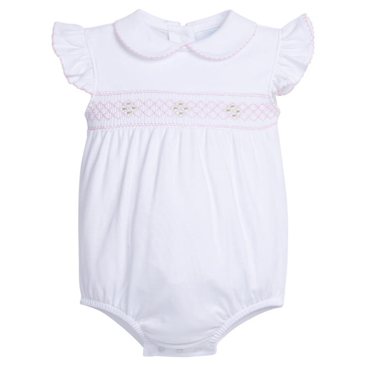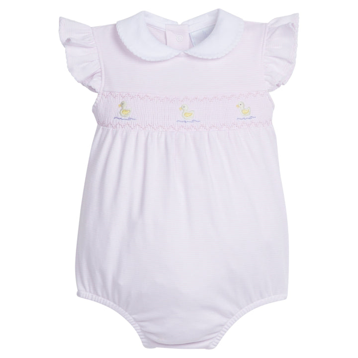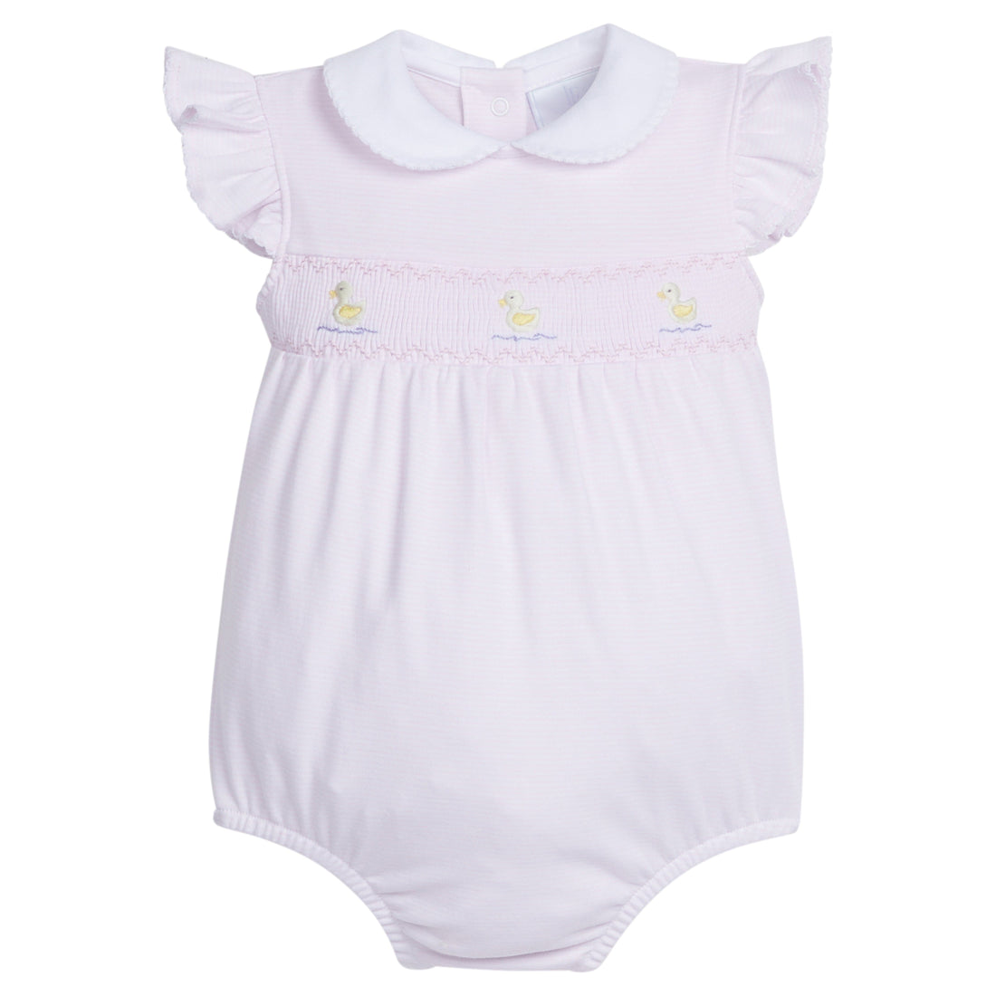 Made from 100% pima cotton, our Smocked Angel Sleeve Bubble - Ducks features a subtle light pink stripe base, angel sleeves and white peter pan collar trimmed in white picot, and beautiful pink smocking with tiny duck embroidery across the chest.  Soft, comfortable, and cute to boot, this darling bubble is sure to be a favorite of both mom and baby!