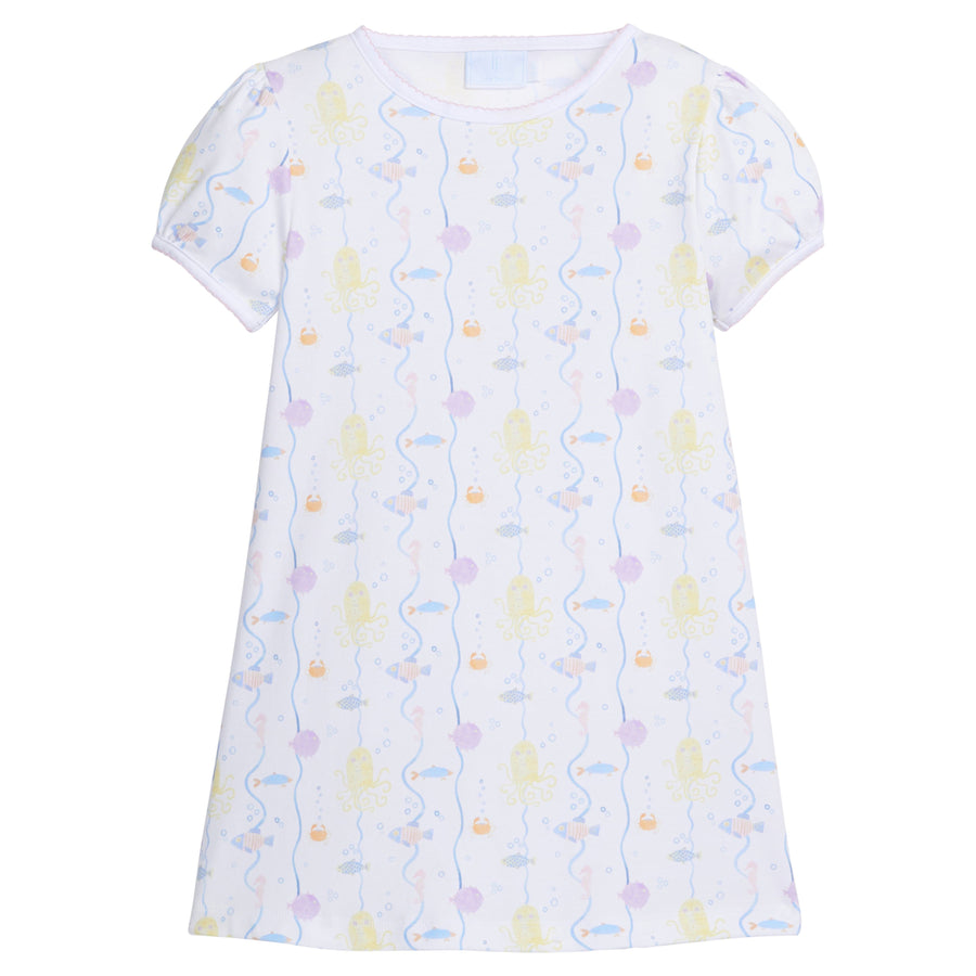 Make a splash this season in our Under the Sea print! Made from our softest white pima cotton, this T-Shirt Dress features a colorful variety of sea creatures and light pink picot trim at the sleeves and neck. Playful and comfortable, your little girl will be o-fish-ally ready for Summer!