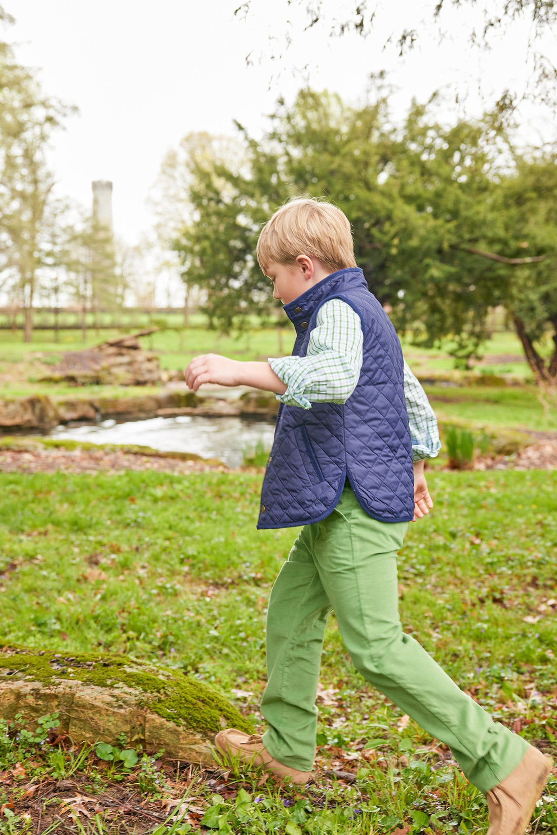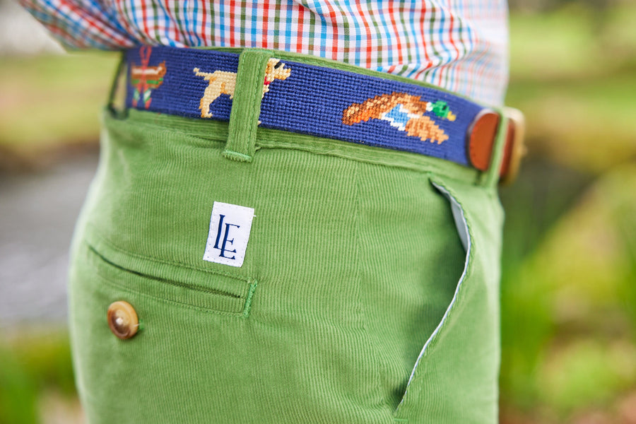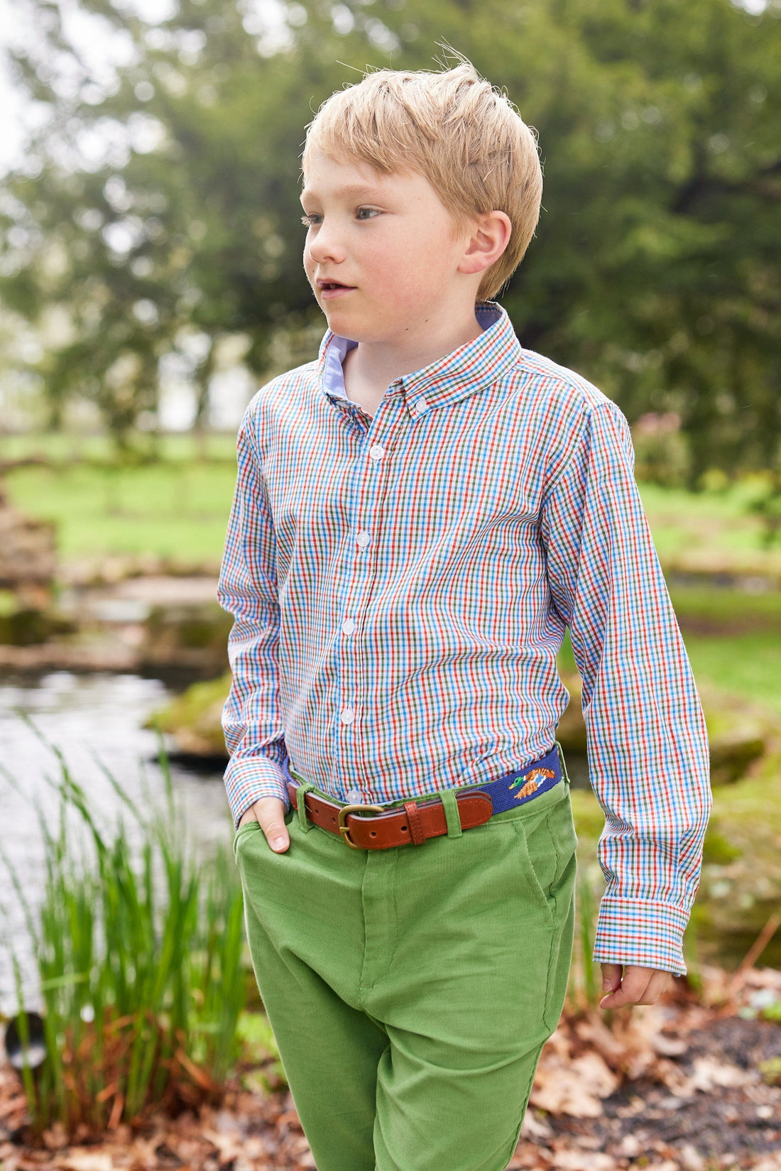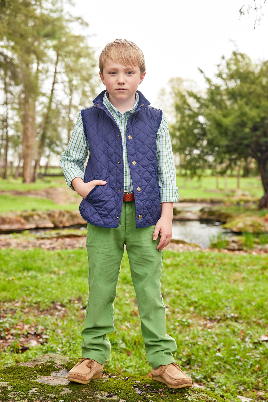 Our Classic Pant has a modern cut that your son will love. It features an interior elastic adjuster for the perfect fit, reinforced knees for hours of play, and a hidden hook and loop closure with a zipper for easy dressing! This Watercress Corduroy style pairs beautifully with our Leland or Teton collections and will take him from school to dinner to play and everywhere in between!