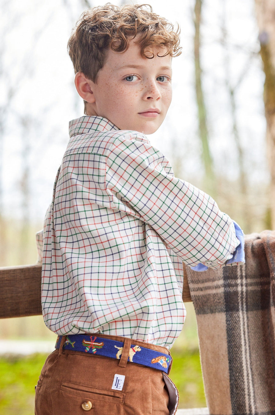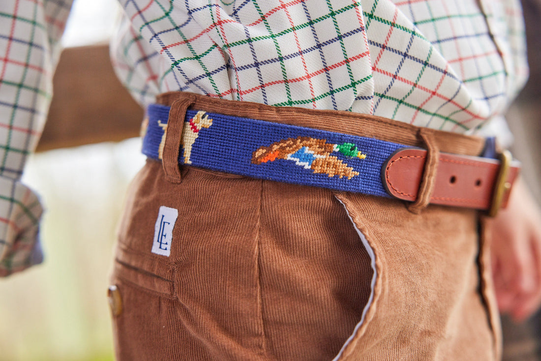 Little English Needlepoint Belts by Smathers & Branson are a timeless addition to your little one's wardrobe. We've designed this belt to embody all things fall with your favorite Little English motifs. It's 100% hand-stitched needlepoint and backed with full grain, Italian leather. Each belt measures 1 inch in width, fitting perfectly through children’s pant belt loops.