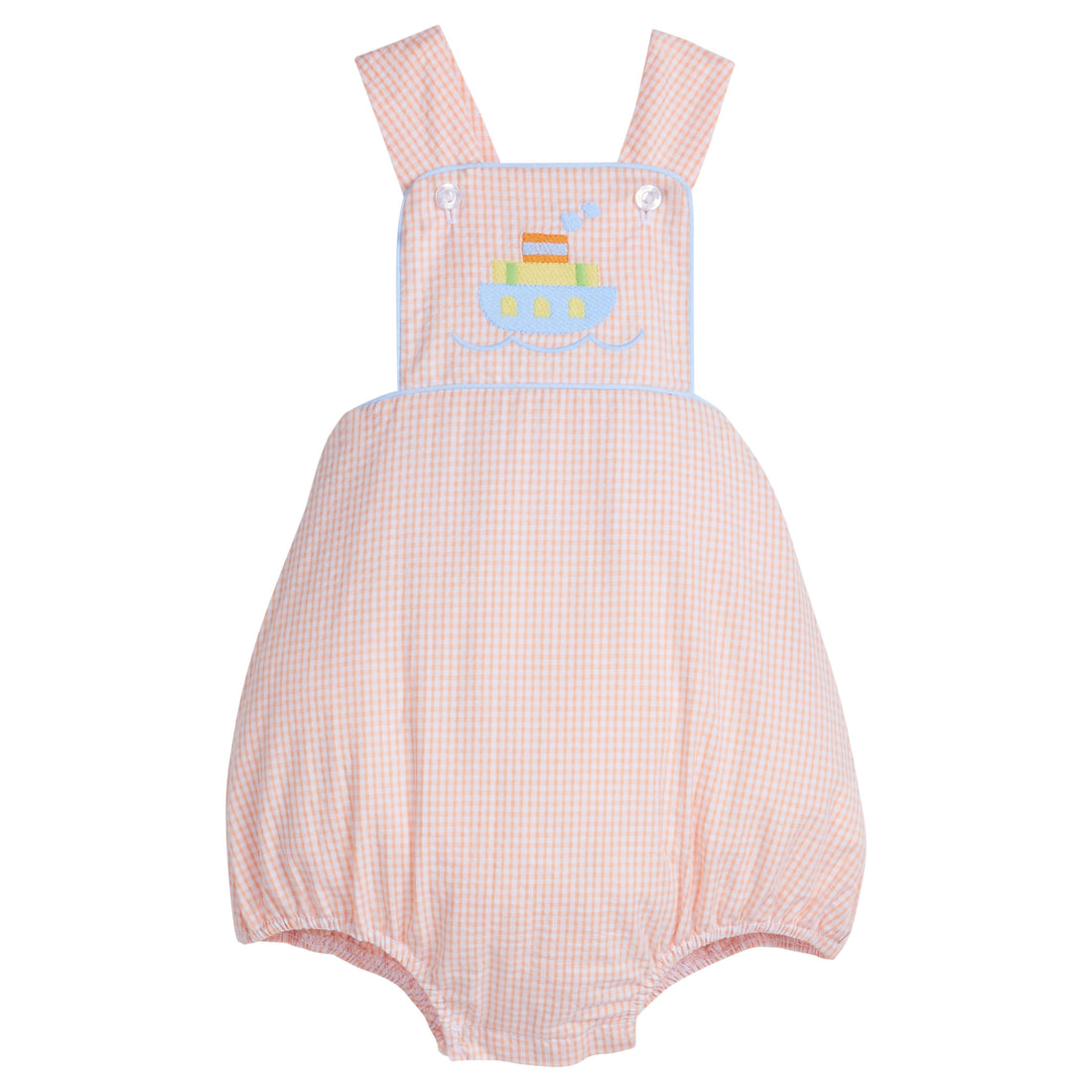 Full steam ahead with our new Tugboat Collection! This playful combination of orange and light blue is the perfect backdrop for our classic and cute tugboat motif.  A new style this season, our Linville Bubble features a narrow-top silhouette with crisscrossed back, an adorable tugboat motif set against an orange and white seersucker check base, and light blue piping around the chest.  Big brother can match in our Applique Basic Short - Tugboat.
