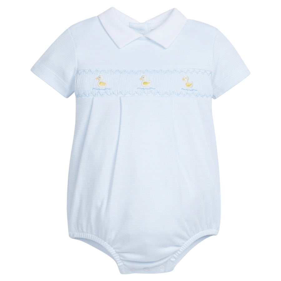 Made from 100% pima cotton, our Smocked Eaton Bubble - Ducks features three embroidered ducks set atop a smocked panel with a white Eaton collar that pops against the light blue stripes. This darling style is sure to be a favorite of both mom and baby!