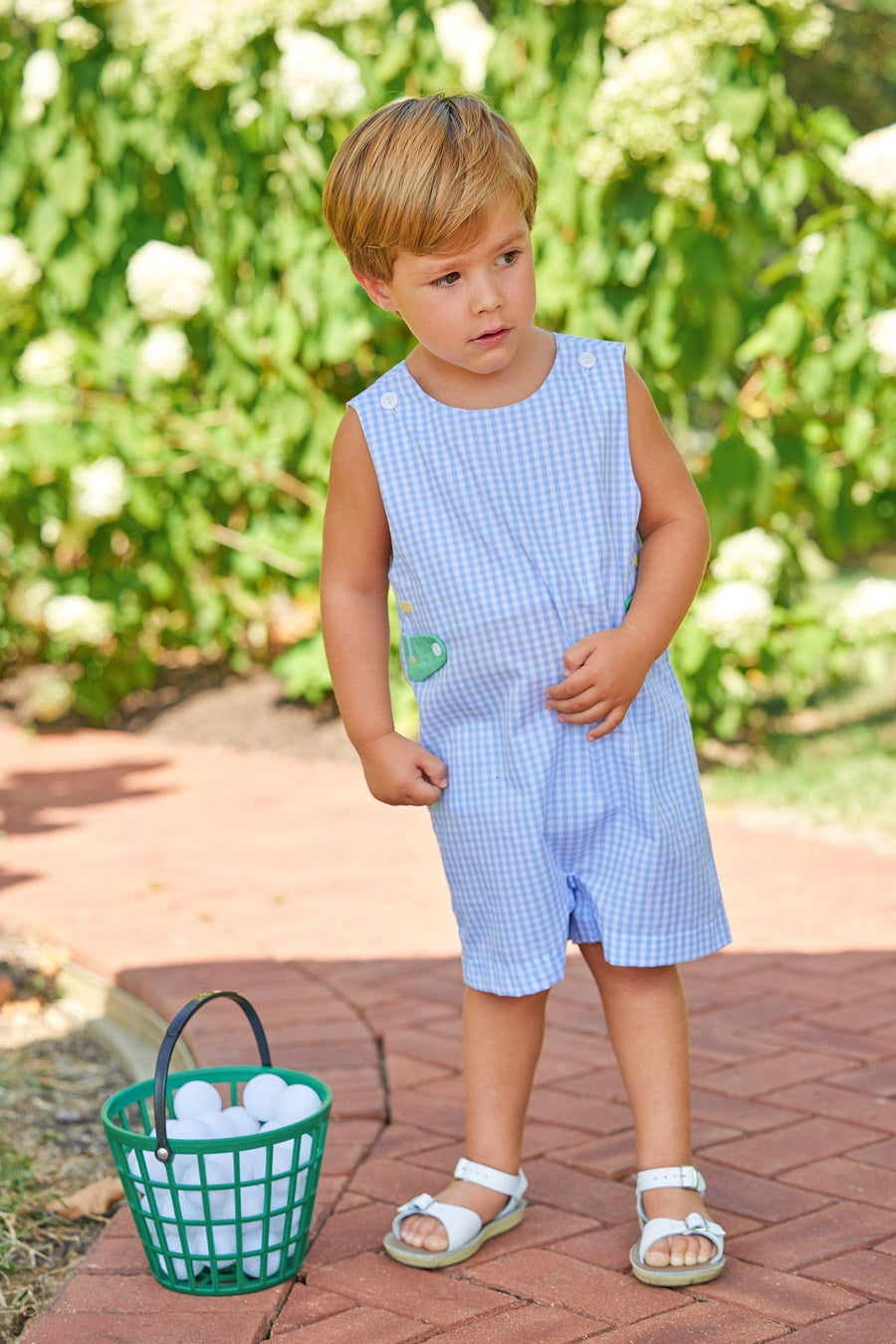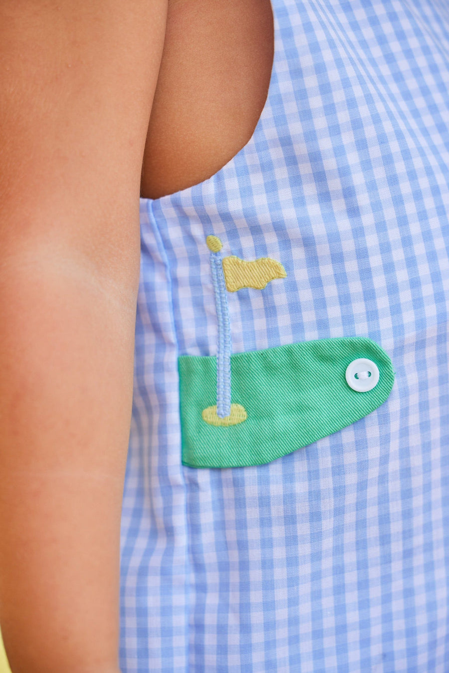 With button closures at the shoulders and snaps at the stride, dressing could not be easier in our Applique Tab John John. This season, we've updated the classic button tabs to be golf greens with yellow pin flags! This super sweet detail is sure to be a hole in one with your littlest golfer.
