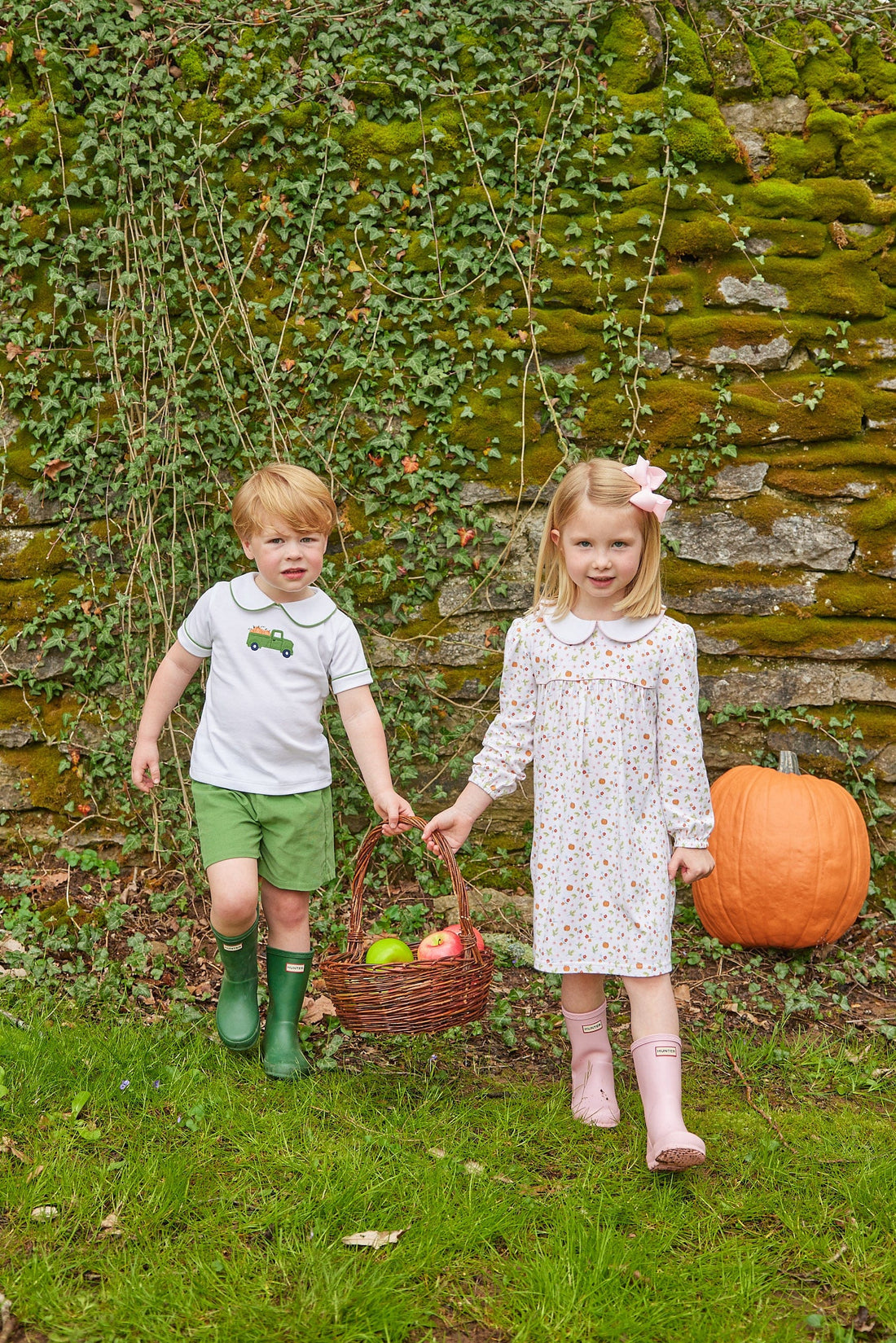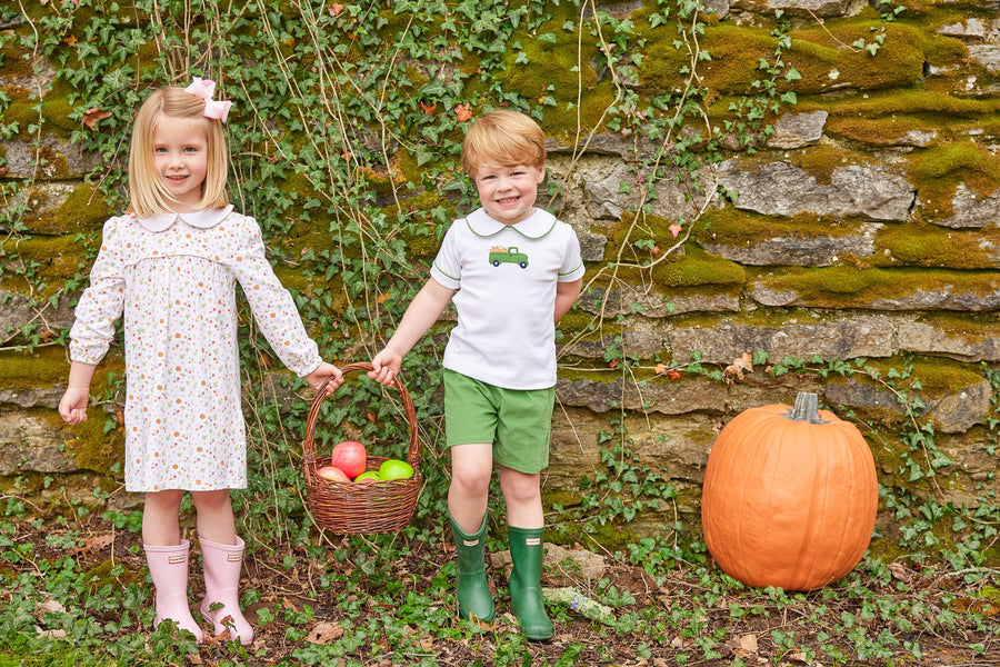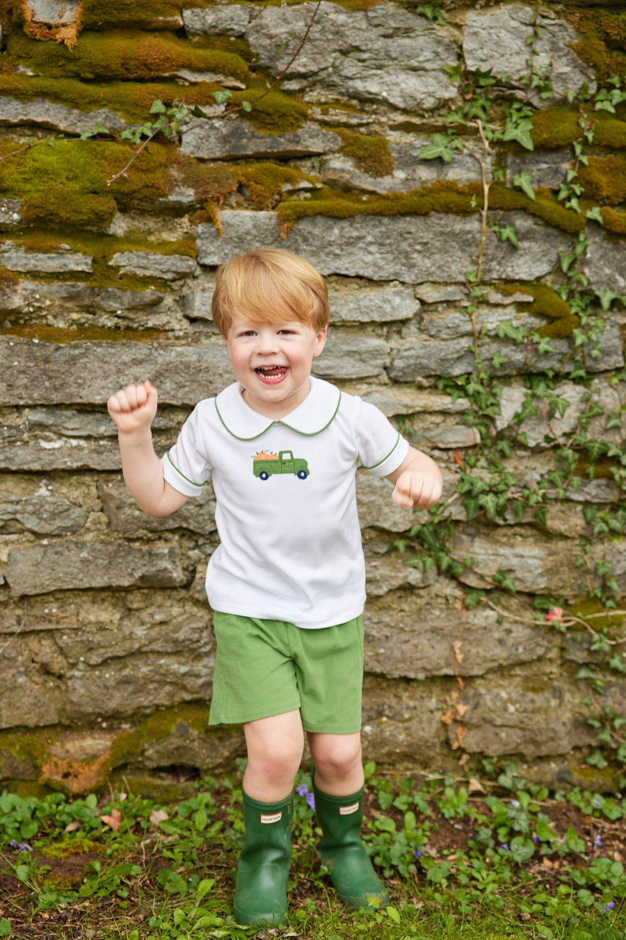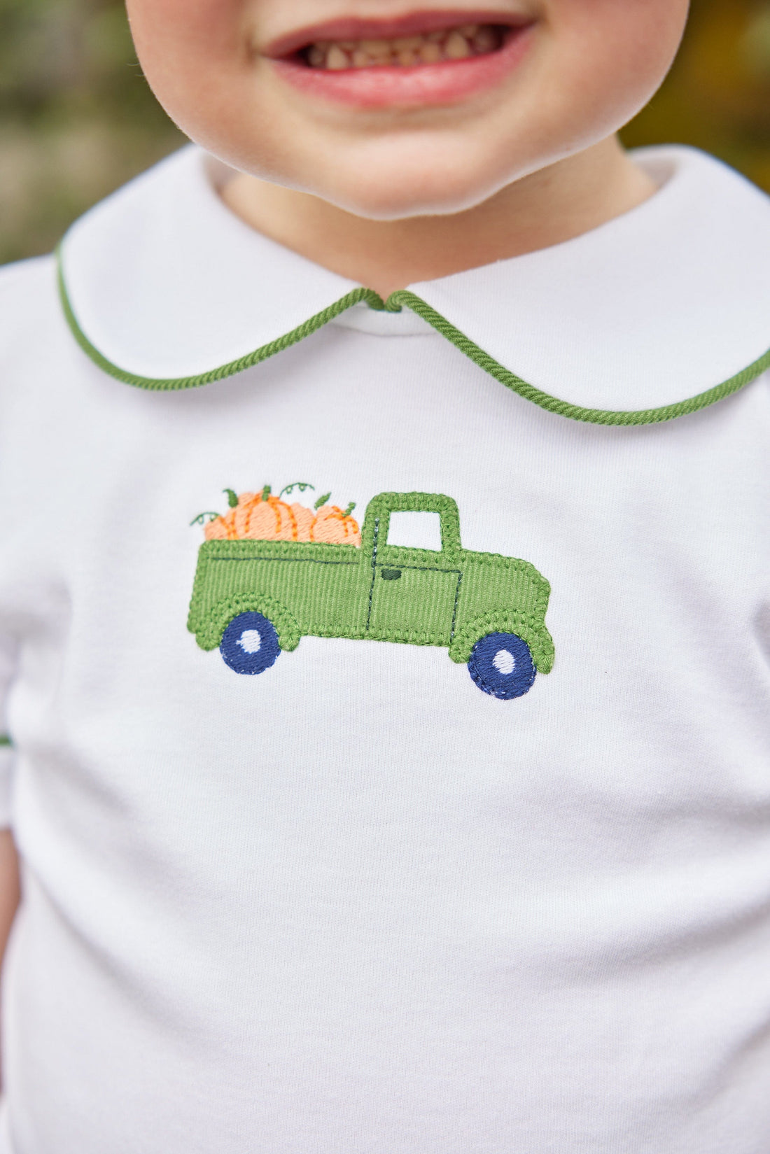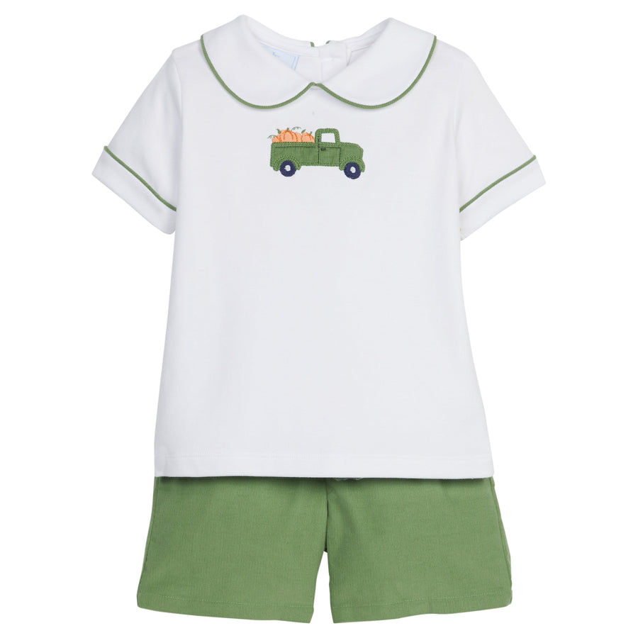 Little English traditional clothing, peter pan short set with green piping and shorts, truck with pumpkin applique on chest