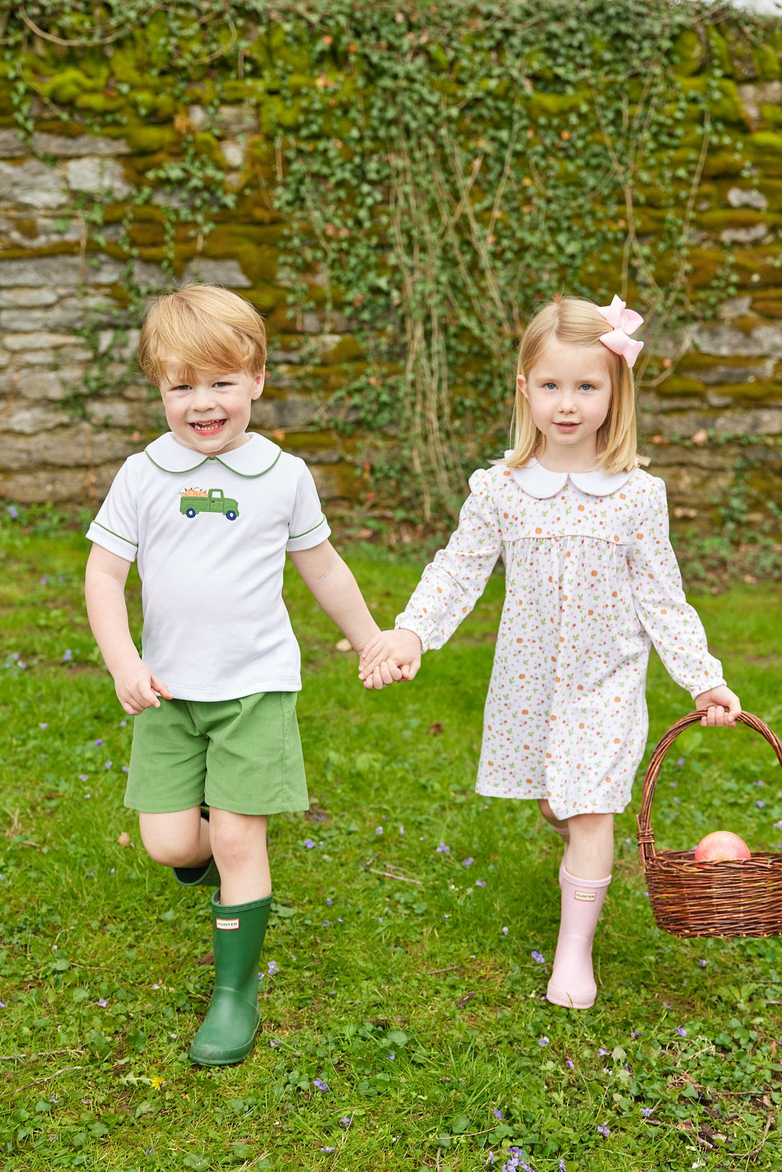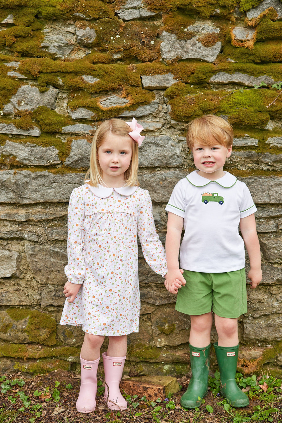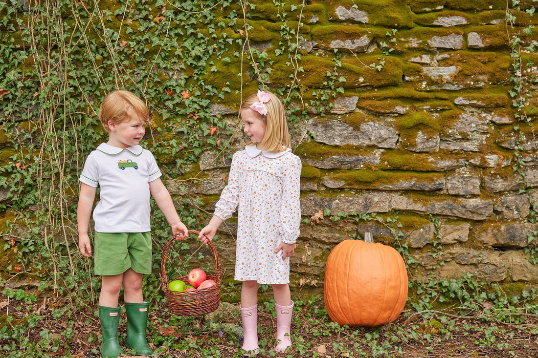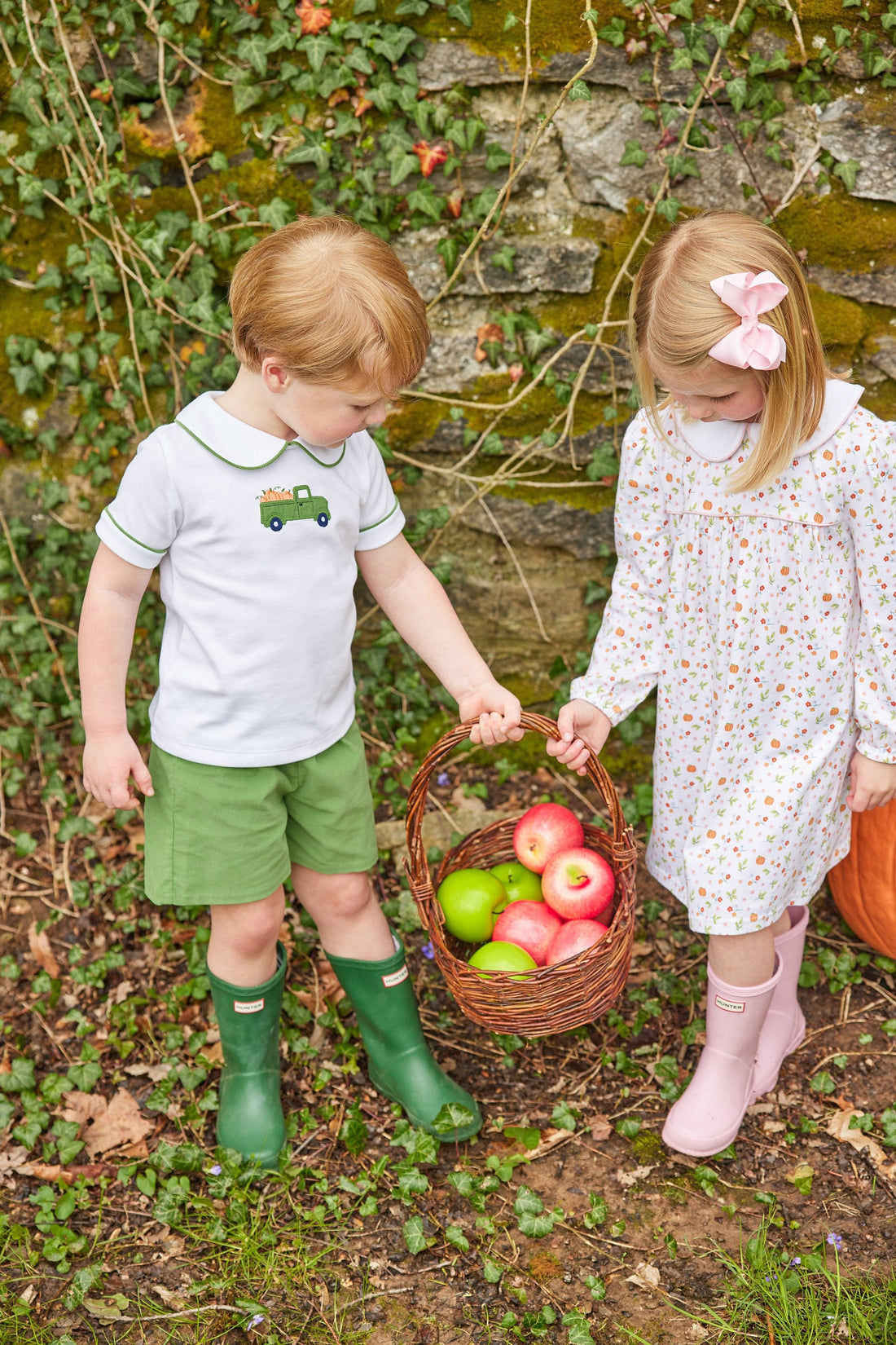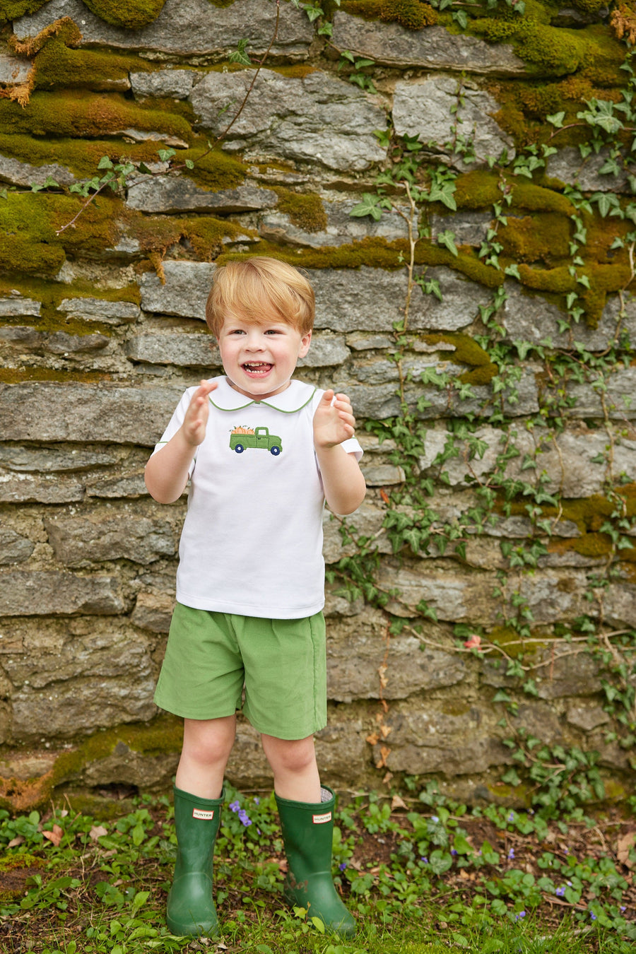 Little English traditional clothing, peter pan short set with green piping and shorts, truck with pumpkin applique on chest