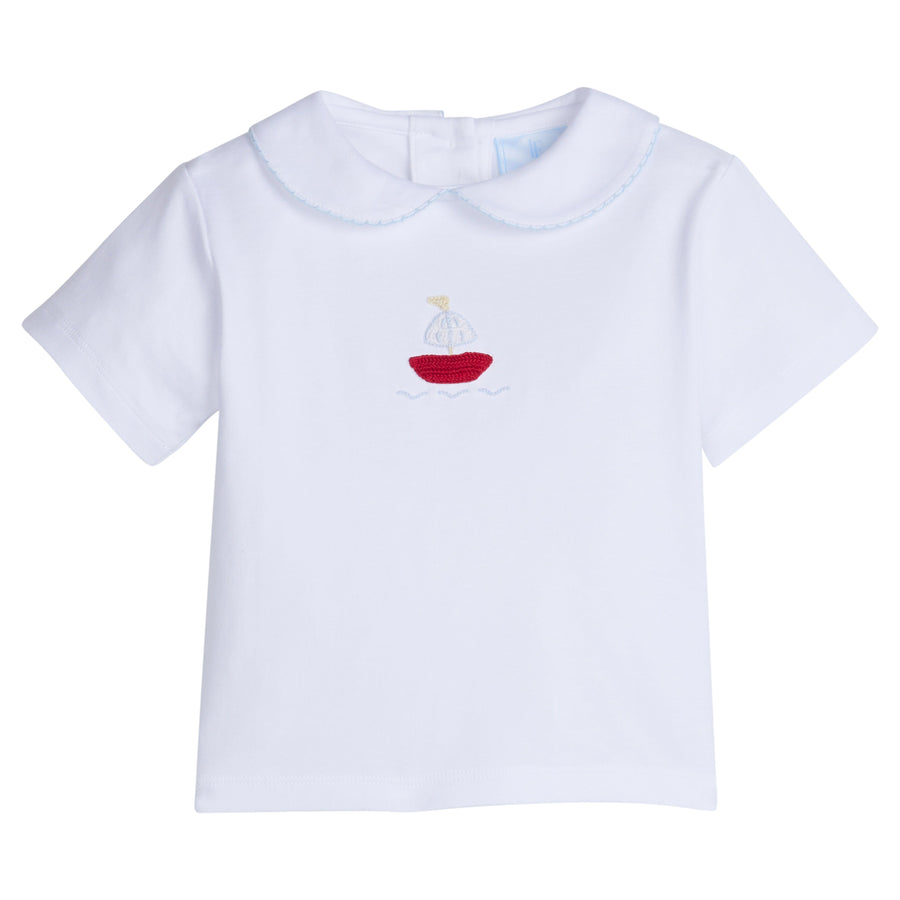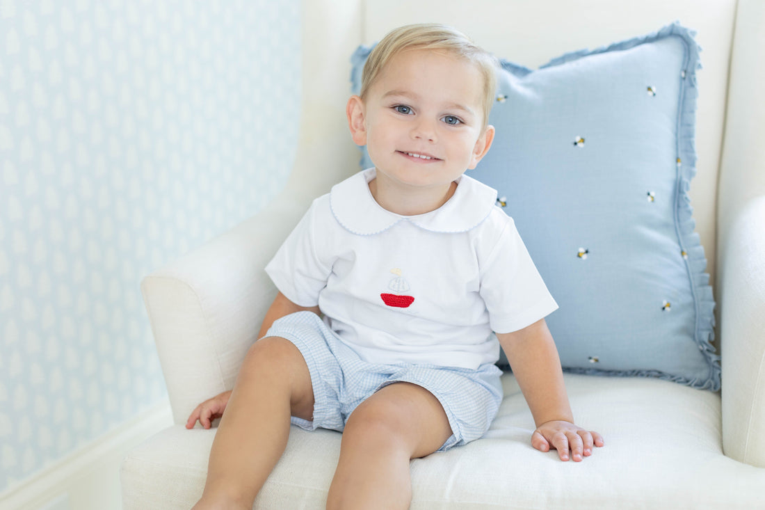Made from 100% pima cotton, our Crochet Peter Pan Shirts are simple, soft, and beautifully made. With light blue picot trim around the peter pan collar and a precious red sailboat crocheted at the center, this piece makes a great addition to your little boy's wardrobe. Pair with our Banded Shorts in Light Blue Mini Seersucker Gingham and baby brother can match in our Crochet Peter Pan Onesie - Sailboat.