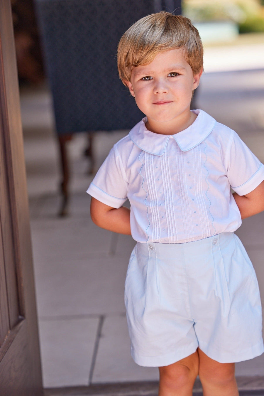 Looking for a dressier option for Easter? Look no further than our Heirloom collection, which features timeless designs in classic colors. Our Francis Short Set is a darling, button-on style with an Eton collar and white contrast binding. The center chest features classic pin-tucks with white embroidery. Your toddler boy will look picture-perfect for any occasion! Plus, baby brother can coordinate in our Francis Bubbles.