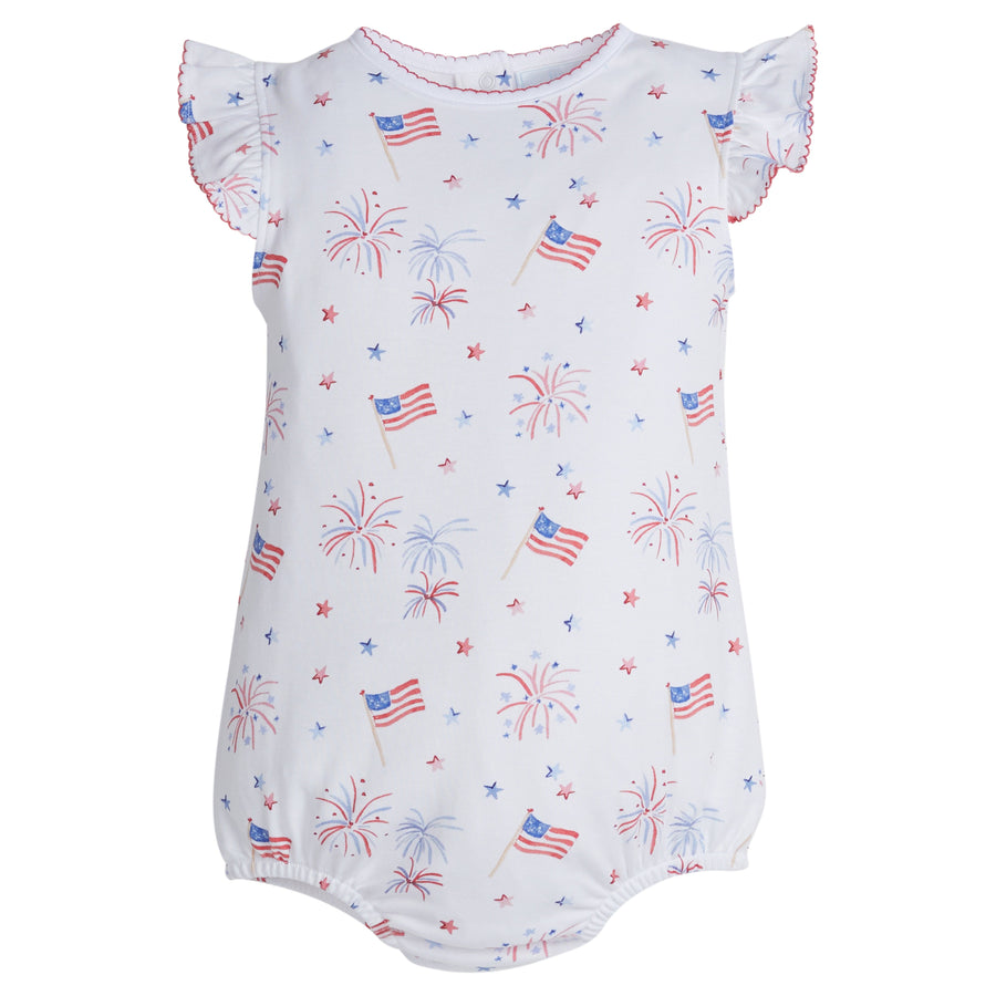 Kick off the celebrations with a bang! Made from super soft pima cotton, this knit bubble features a patriotic print and red picot trim at the neck and flutter sleeves. Perfect for all day Fourth for July play, your little one will just love this comfy classic.  Plus, big sister can match in our Angel Sleeve Dress - Flags.