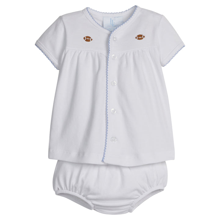 Sweet, yet practical, our knit sets are an essential in every infant's closet! This soft cotton set features light blue picot trim and darling embroidered yellow duckies on each side of the chest and one in the center of the back of the diaper cover. Layer on our coordinating Crochet Cardigan for a classic & cozy look.