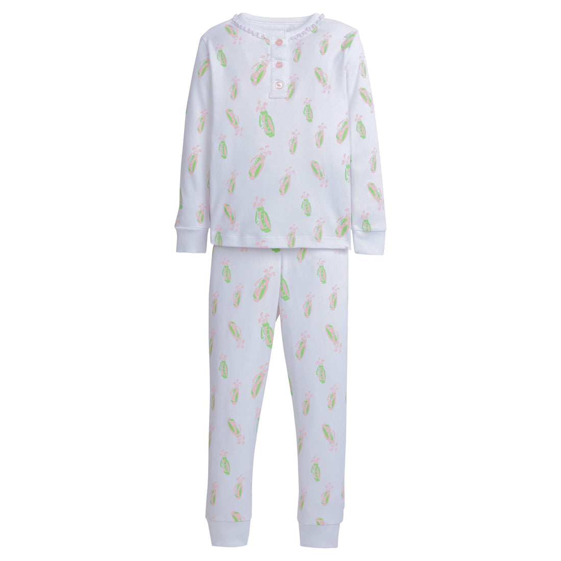 Golf prints for spring are just par for the course at Little English! Made from our softest white pima cotton with small ruffle detailing at the neck, this print features adorable light pink and green golf bags, just right for Spring! Your little girl will love this design, and baby sister can coordinate in our matching Zippered Footie - Pink Golf.