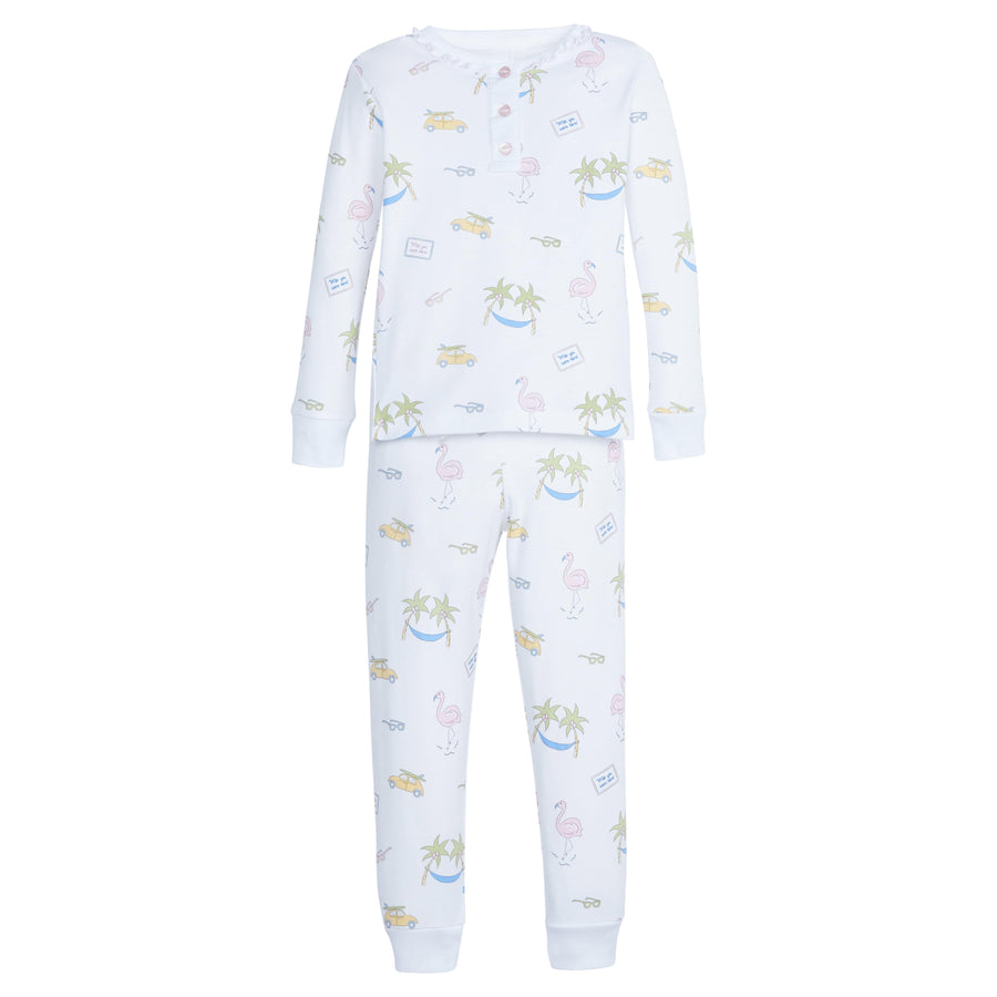 It's time to get away with our new vacation themed jammies! Made from our softest white pima cotton, this print is just right for your next summer getaway!  Your little girl will love this design, and brother can coordinate in our matching Printed Jammies - Wish You Were Here.