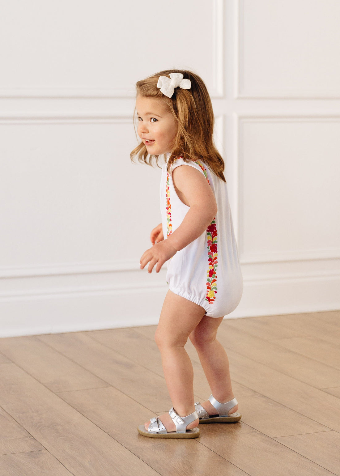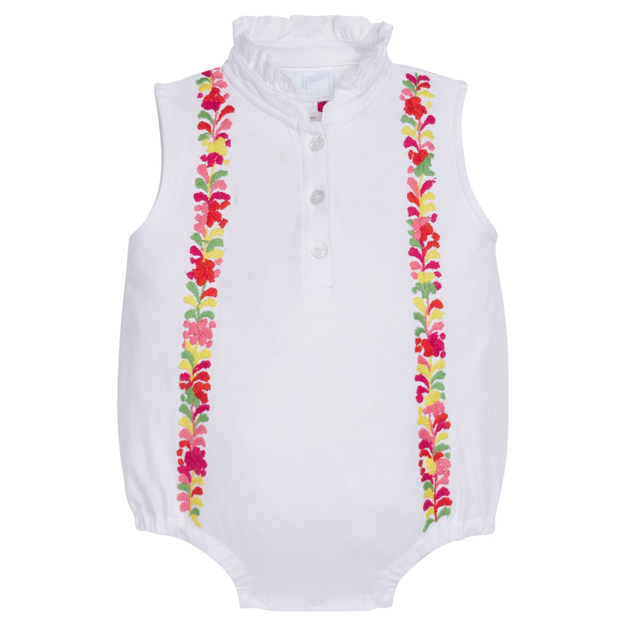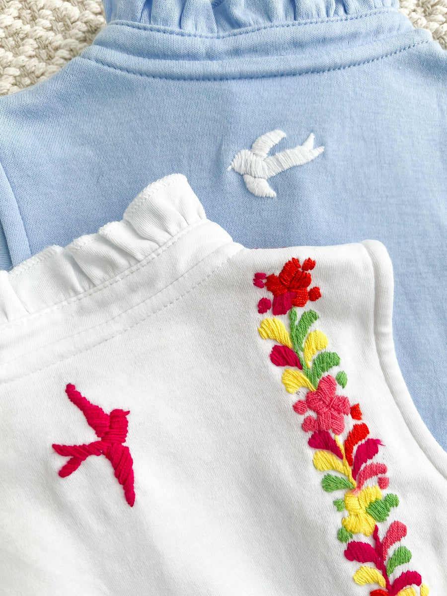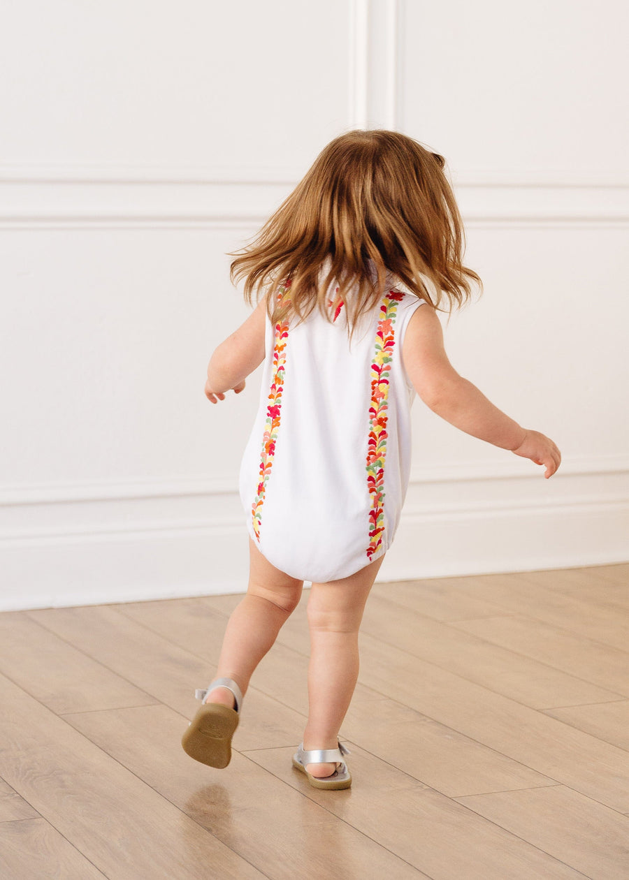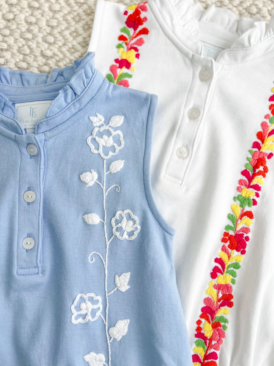 Classic LE styles merge beautifully with hand-embroidered details in our newest collaboration with Mi Golondrina. This simple, white knit Hastings Polo Bubble is the perfect backdrop for two lines of beautiful, multicolored floral embroidery to pop along the front and back. This collaboration is something truly special & was designed to pass down for seasons to come! Big sister can match perfectly in the Embroidered Sleeveless Hastings Polo Dress in White.