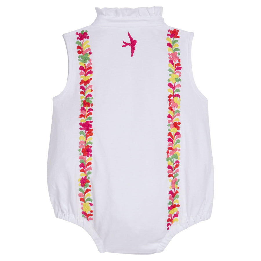 Little English x Mi Golondrina white cotton bubble for spring, baby girl's sleeveless polo bubble with multicolored embroidery