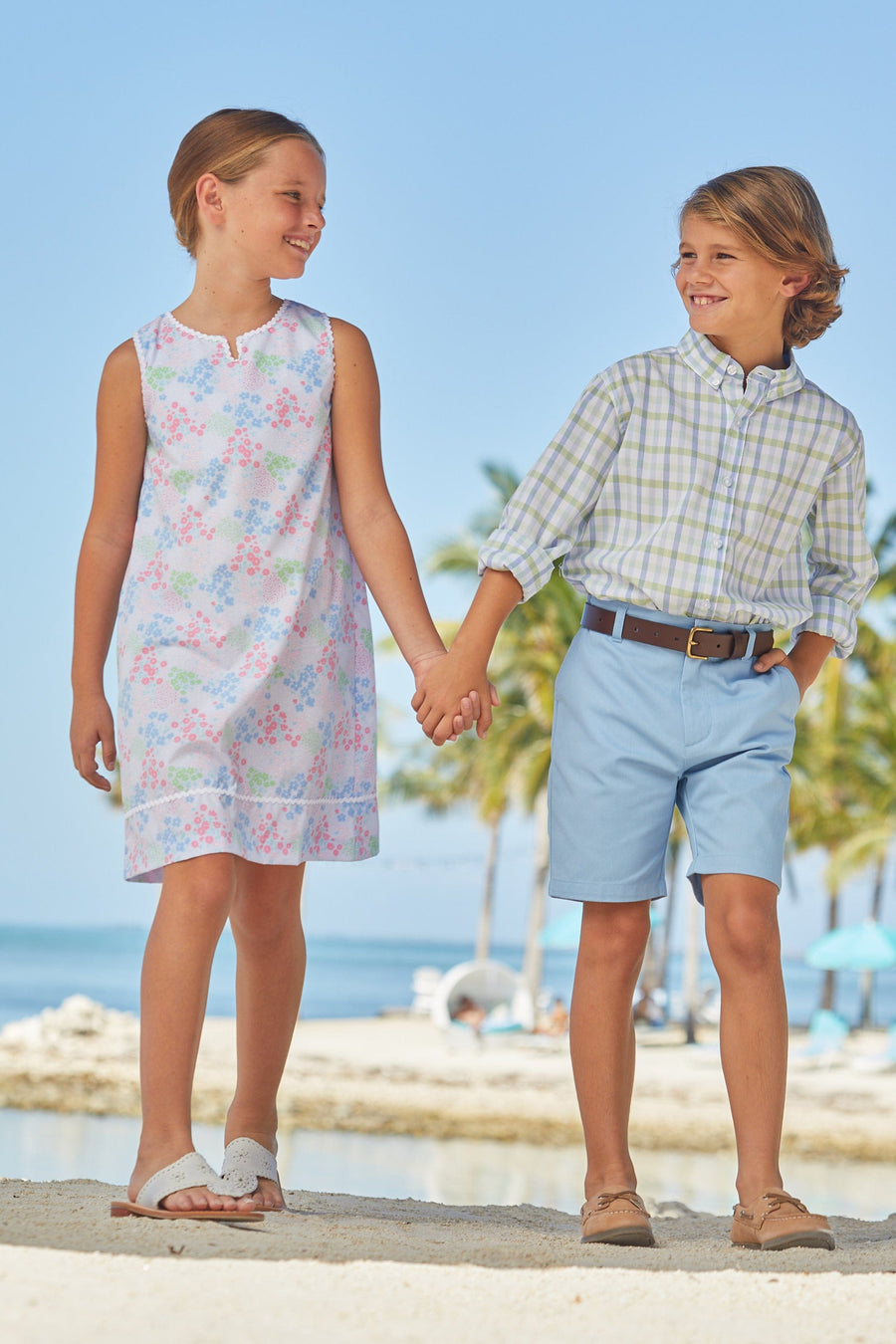 A fan favorite, our Olivia Dress is back in our new Wingate Floral!  Featuring a lavender base with bright pops of blue, pink, and green florals and white rick rack trim at the neck and hem, this eye-catching style is sure to be a much-loved piece in your older girl's wardrobe.  Little sister can easily match in our Chelsea Sundress - Wingate Floral.