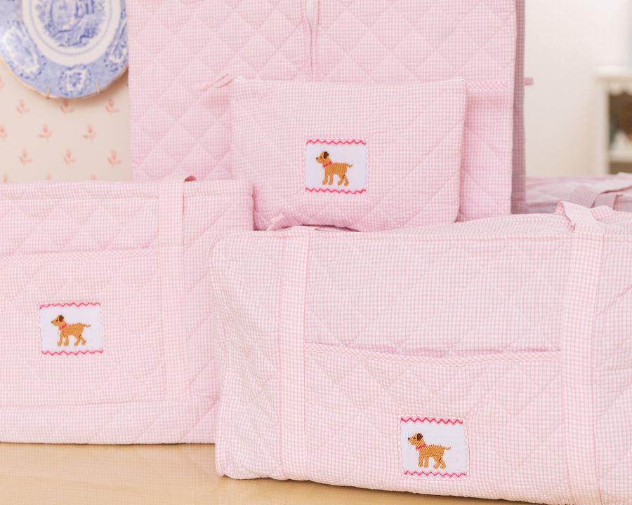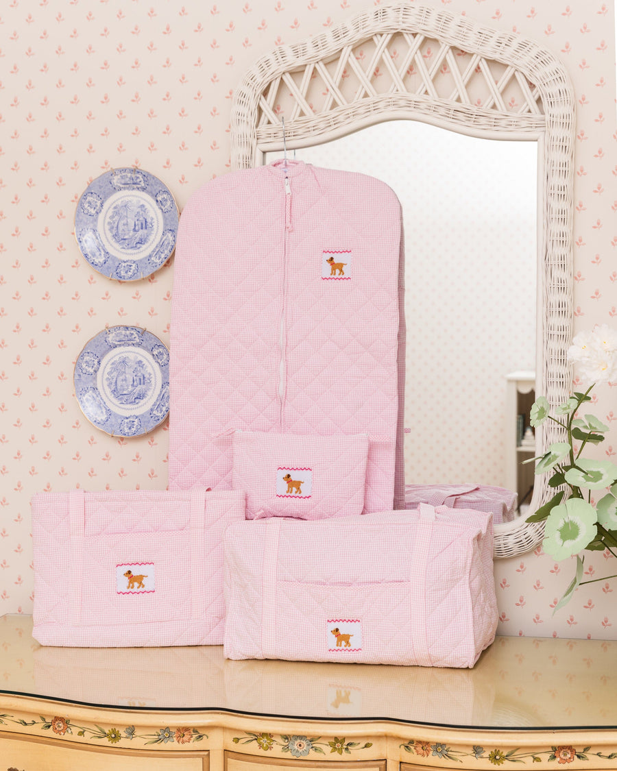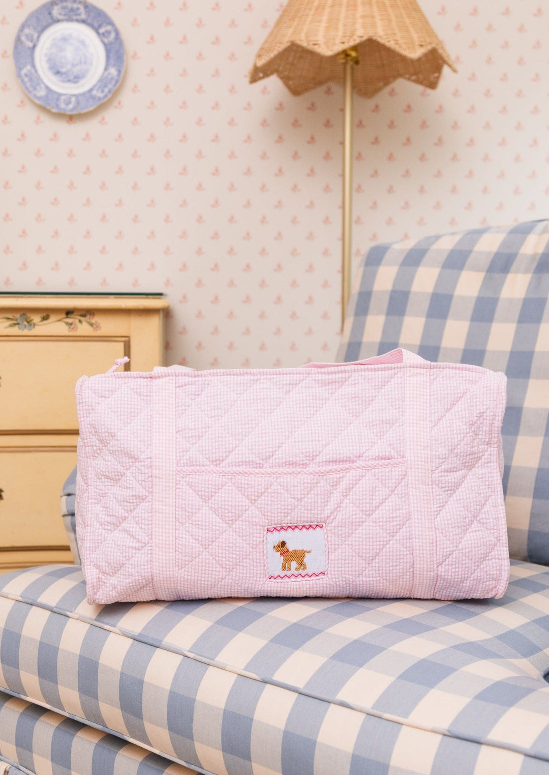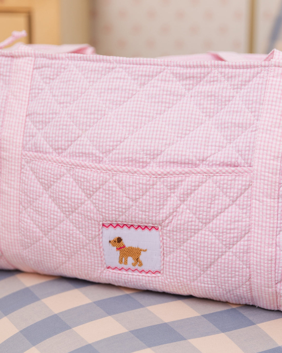 Our full set of luggage includes our garment bag, duffle bag, tote bag and cosmetic! From spending the night out to packing for a weekend trip, let them travel in style. Our smocked Girl Lab is on Light Pink Seersucker and is perfect for little girls on the go. This style is in the 1.5 in. diamond quilting pattern.