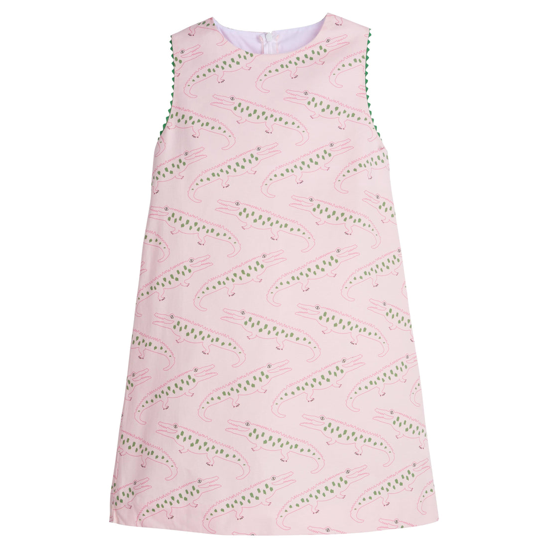 Little English traditional children's clothing. Girl's pink and green alligator print shift dress for Spring.  Preppy dress for girls