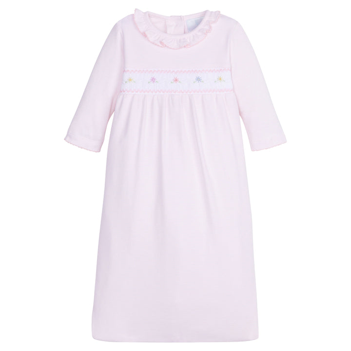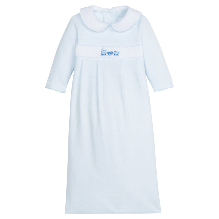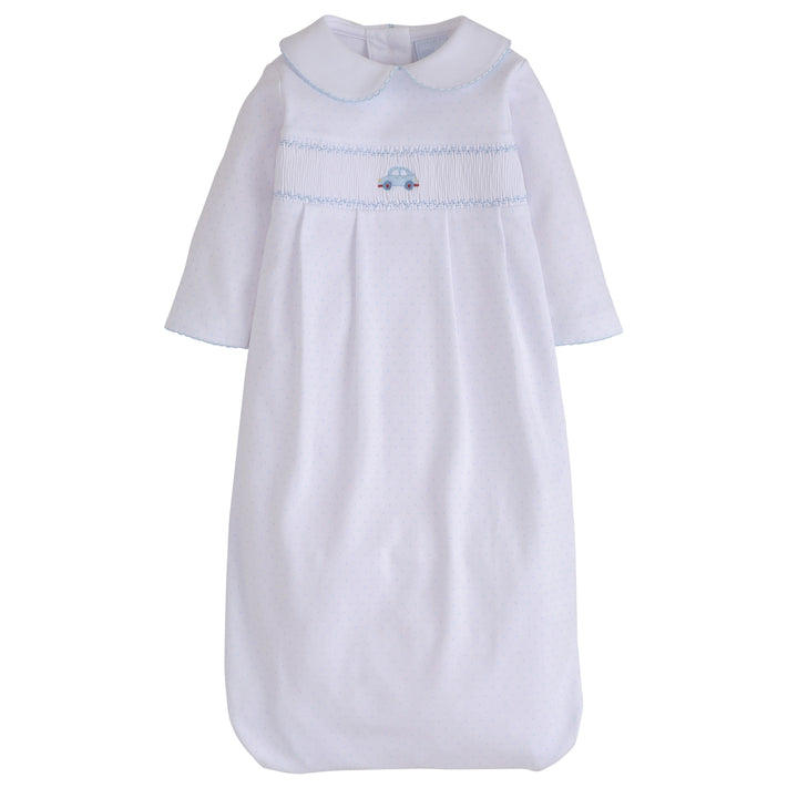 Our Smocked Newborn Gowns make the best gifts for baby. This style features a light blue dot print set against a white base, a peter pan collar trimmed in light blue picot, and beautiful smocking across the chest with an adorable embroidered car in the center. Made from 100% Pima cotton, this gown is a soft and comfortable choice both mom and baby will love. Plus, a sack bottom with snaps makes diaper changes easy!