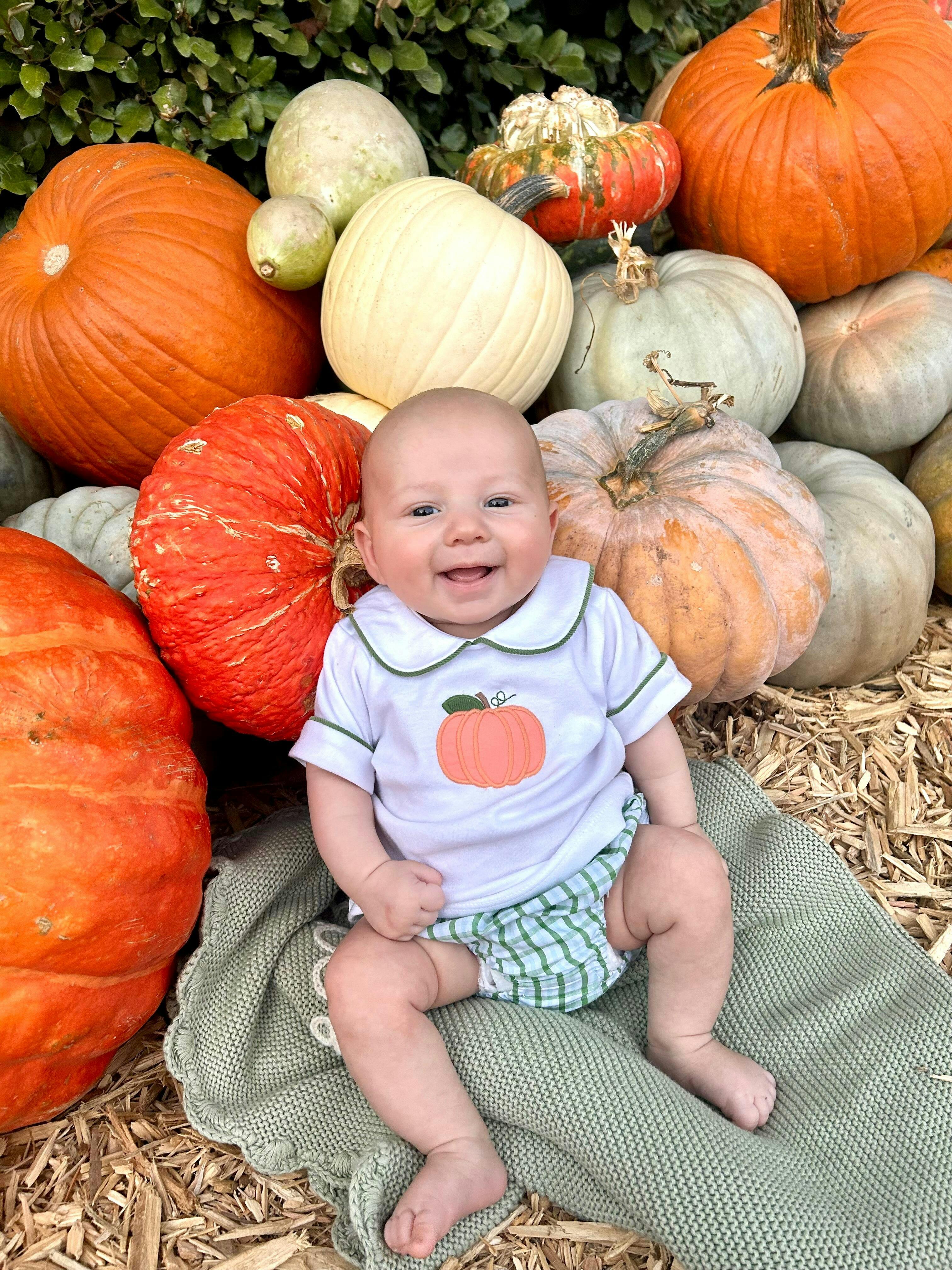 Picture-perfect pumpkins! This darling Applique Peter Pan Diaper Set combines a white knit peter pan top with watercress piping with our signature jam panty in Leland Plaid. The center applique features an adorable orange pumpkin for a fun and festive fall look, plus big brother can easily match in our Applique Peter Pan Banded Short Set.