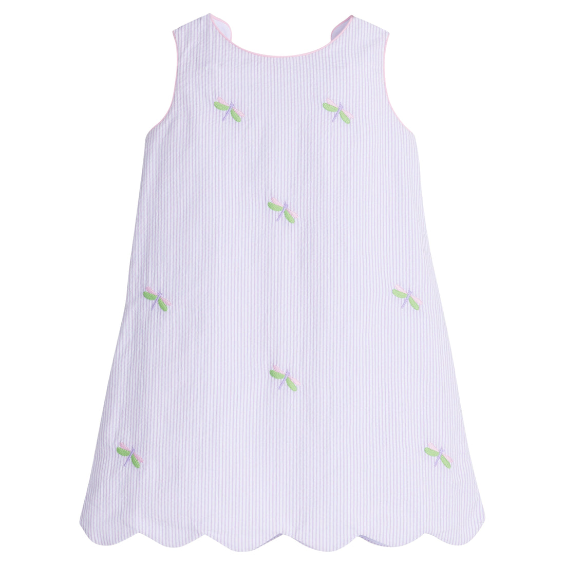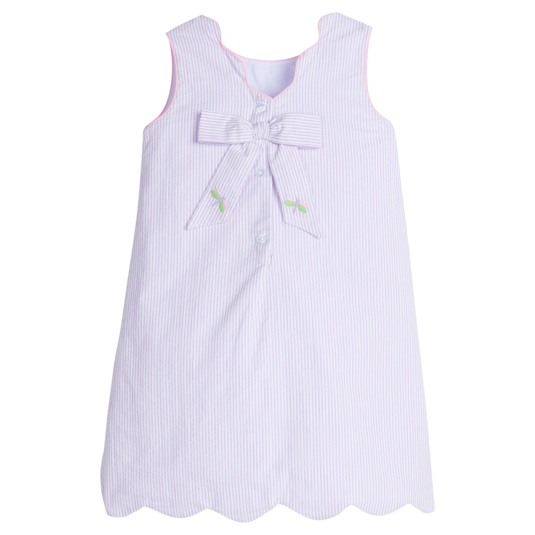 Everyone will be buzzing about our All Aflutter Collection. The Embroidered Bow Back Dress is back this season in a beautiful lavender stripe seersucker. This classic Little English style features a scallop hem with a fixed bow on the back and is adorned with embroidered dragonflies all over.  And baby sister can easily match in our Embroidered Bow Back Bloomer Set!