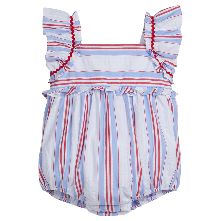 Celebrate all summer in seersucker stripes! Our Americana Collection features a varied red, white, and blue stripe that’s the perfect patriotic pick for boys and girls. The Rollins Bubble is a new style this season with ruffled sleeves and gathers at the waistband.  Ruffle detailing at the waist and red rickrack at the sleeves gives this bubble an extra special feel, great for Fourth of July celebrations and beyond.