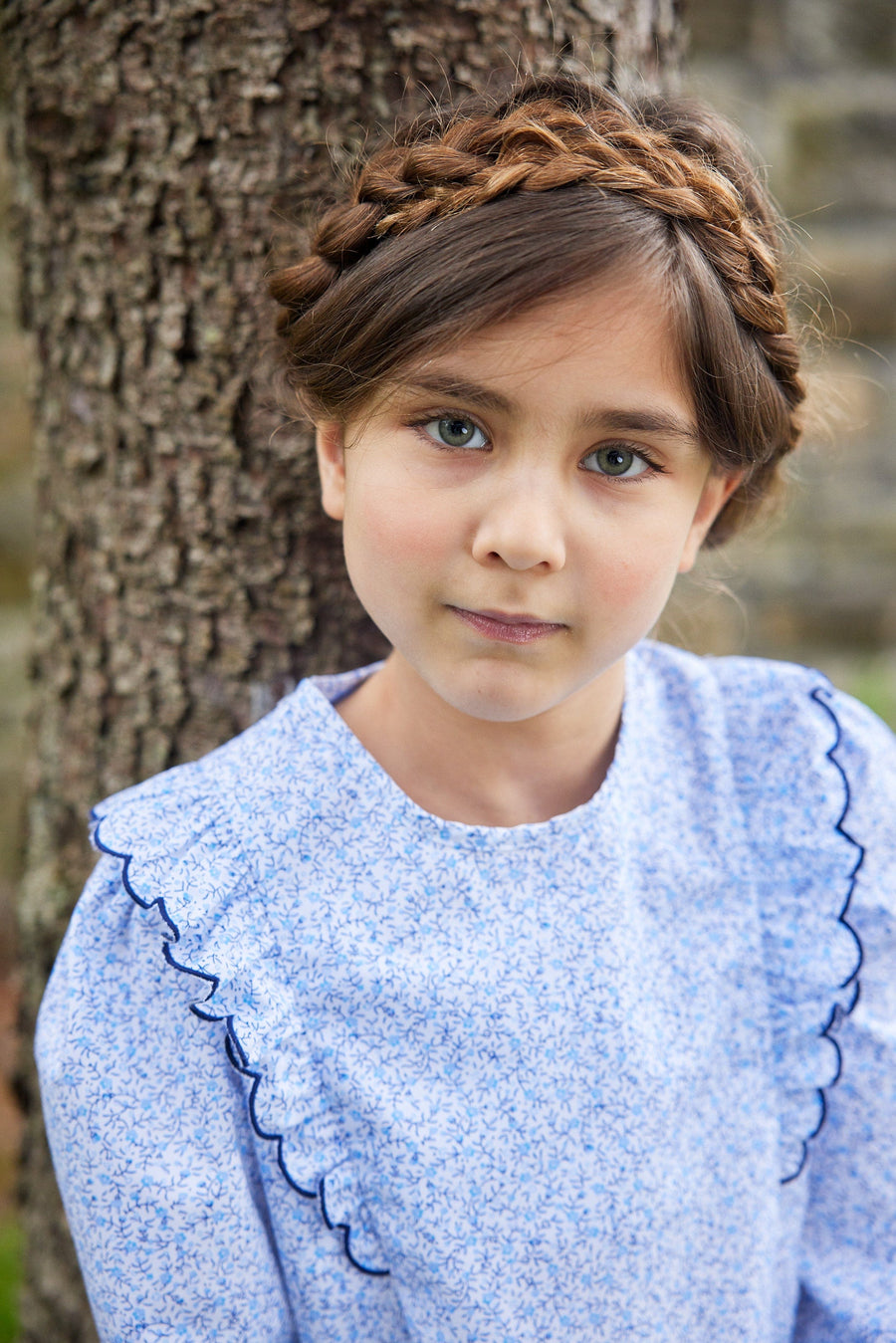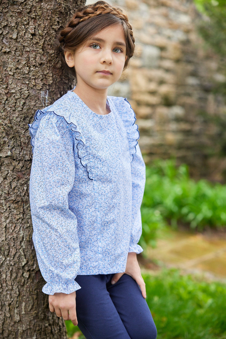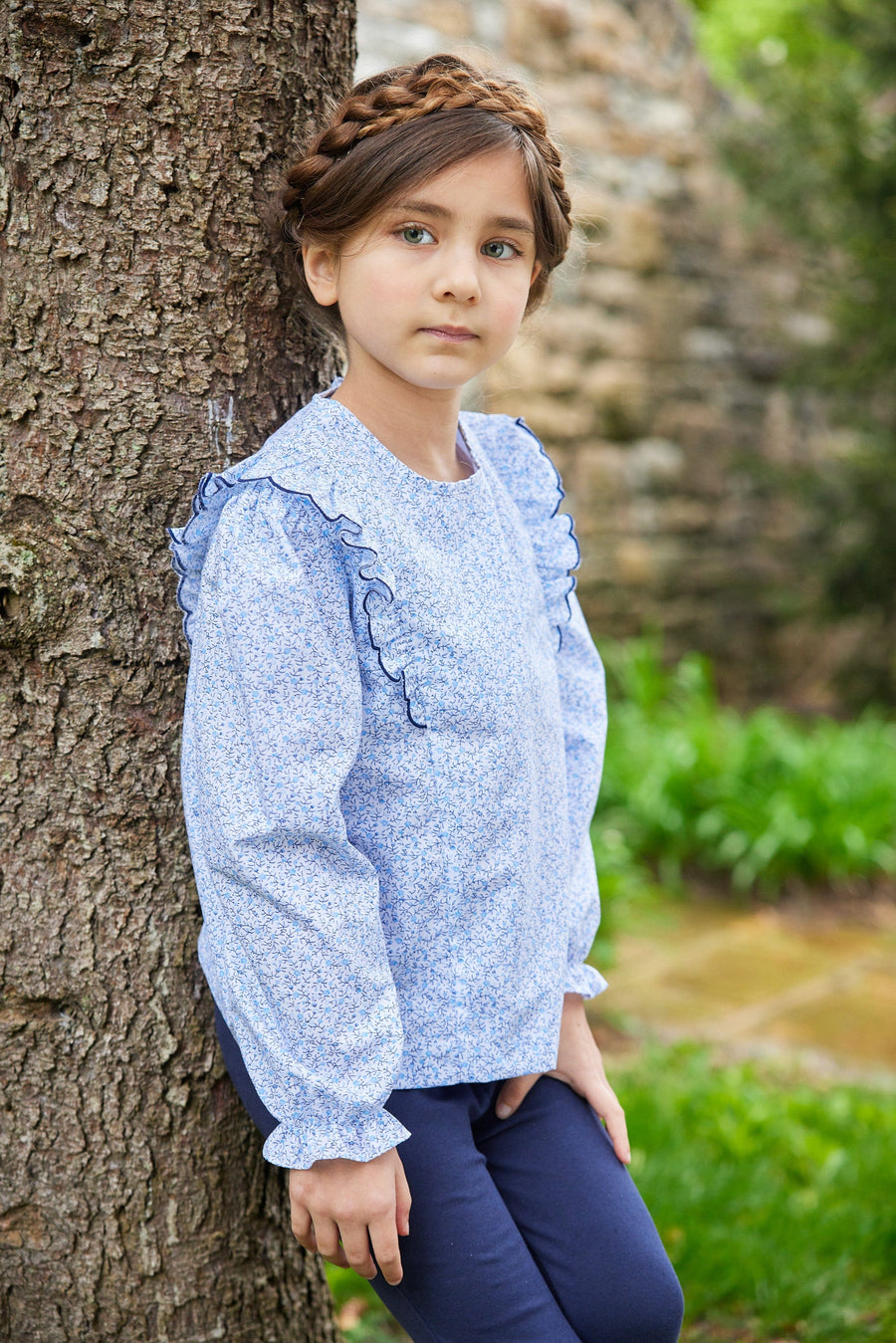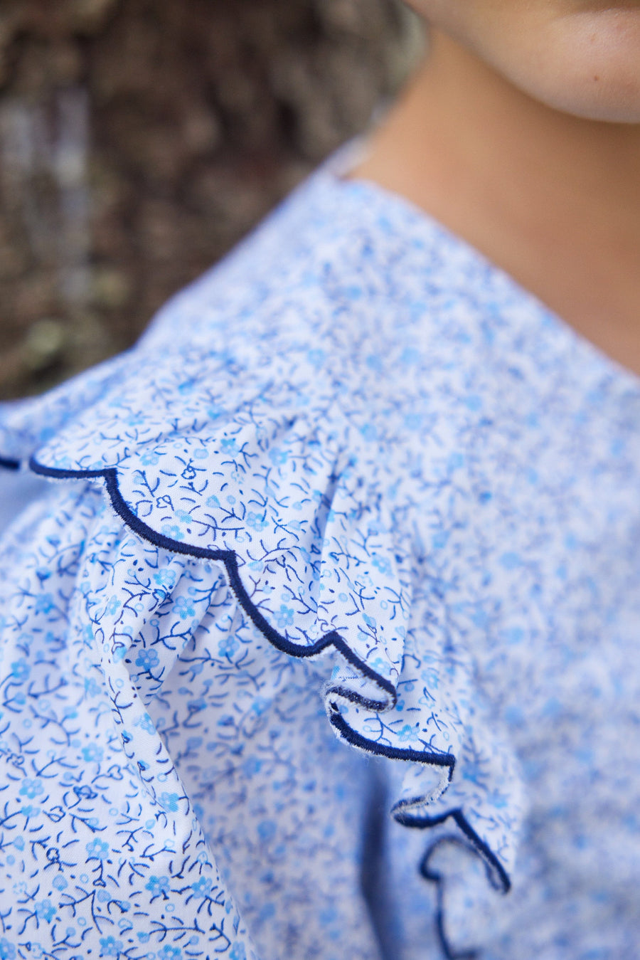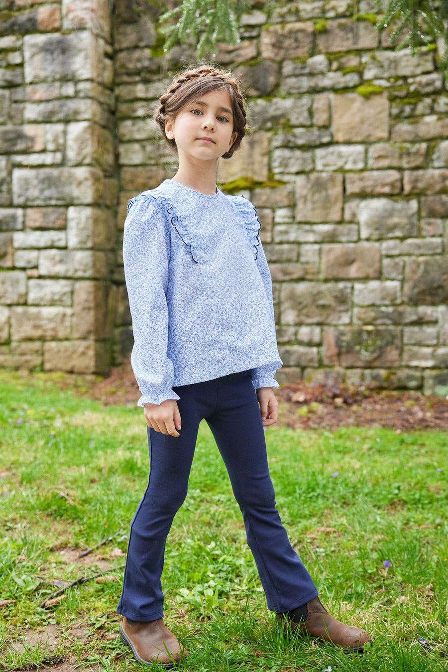 Delicate blue florals on navy stems paired with a classic plaid in the sweetest shades of blue make our Blue Ridge Collection a fantastic option for fall family photos. Simple yet stunning, this collection features coordinating styles from baby to big kid. Our Flutter Blouse is a beautiful new style this season with gorgeous scalloped detailing edged in navy along the shoulders. Pair with our Kick Flare Leggings in Navy for a comfortable yet sophisticated outfit your older girl is sure to love!