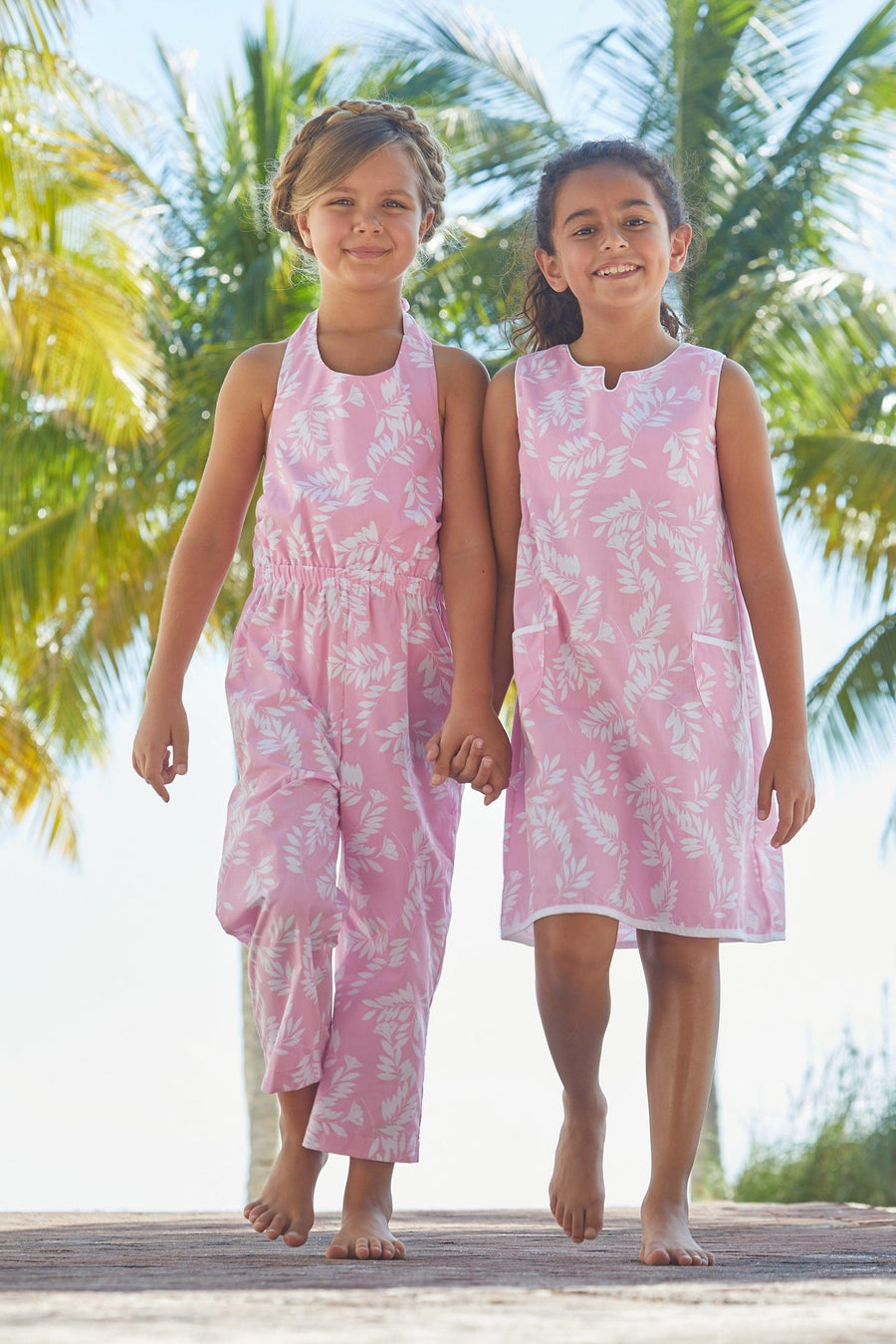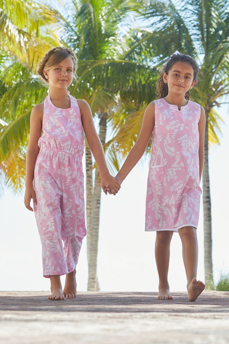 Havanna, oo la la! Von Geburtstagsfeiern bis zu Sommerausflügen wird Ihre ältere Tochter diesen edlen Tropendruck lieben. Mit einem Neckholder zum Binden und einem voll elastischen Bund ist Ihre ältere Tochter in unserem beliebten Neckholder-Jumpsuit gut gekleidet und bequem. Kleine Schwestern können sich problemlos für bezaubernde Familienurlaubsfotos in jedem unserer anderen Pink Havana-Teile zusammentun.
