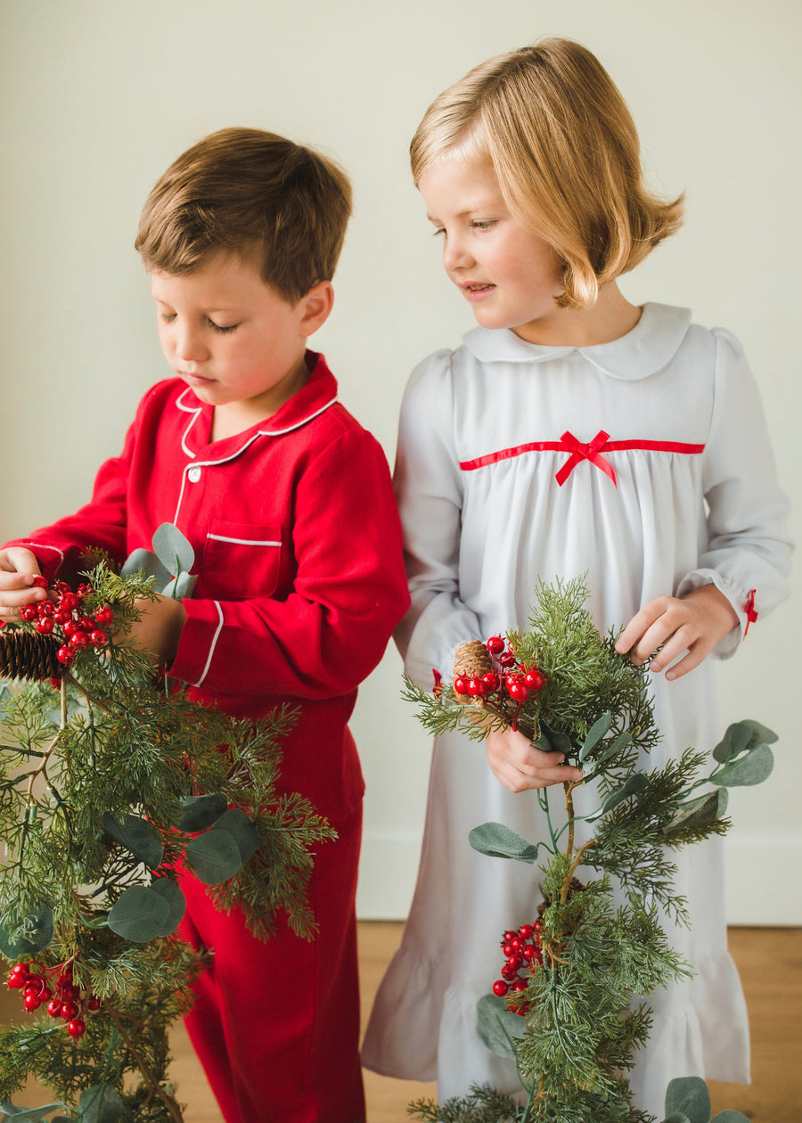 Little English classic flannel style pajama set, kids traditional christmas pajamas in red with coordinating nightgown for girls