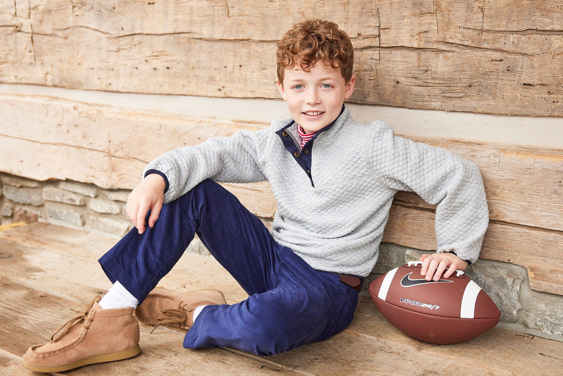 Unsere klassischen Hosen sind ein Muss für heranwachsende Jungen. Sie verfügen über einen elastischen Innenversteller für die perfekte Passform, verstärkte Knie für stundenlanges Spielen und einen versteckten Klettverschluss mit Reißverschluss für einfaches Anziehen. Unser Navy Cord ist eine frische Farbe, die perfekt für den Herbst ist! Kombinieren Sie sie mit unserem Navy Gingham Button Down und Oatmeal Quarter Zip für eine klassische LE-Passform.