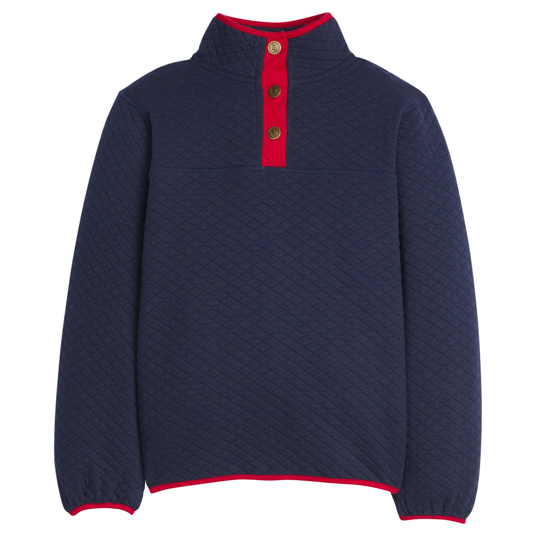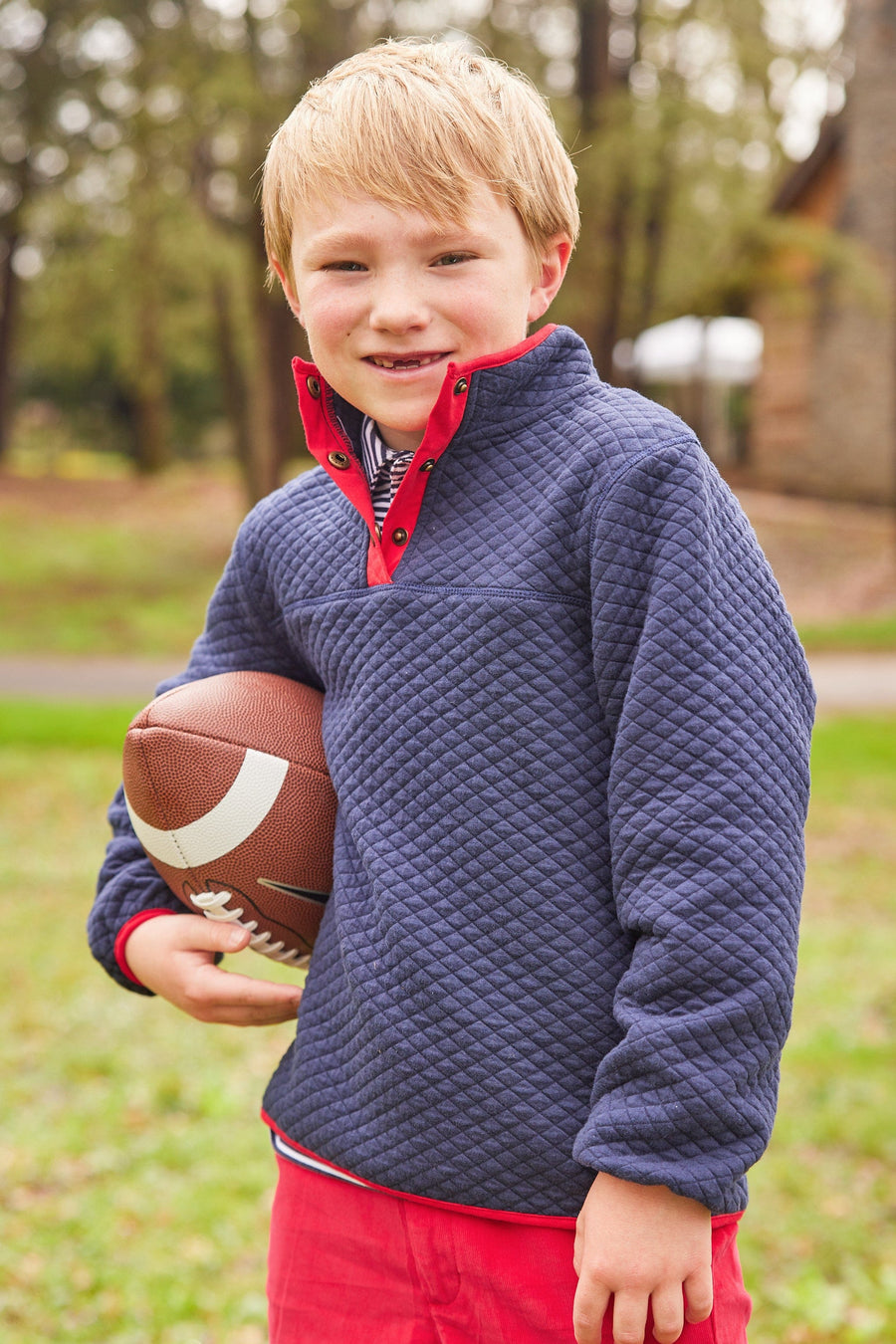 Our Classic Quilted Pullovers are must-have for the season! Perfect for those chillier days, this style features branded brass snaps, a handsome navy quilted base, and red trim at the collar, cuffs, and hemline. Comfy, versatile, and above all- stylish; this pullover will become an instant favorite in your son's closet!