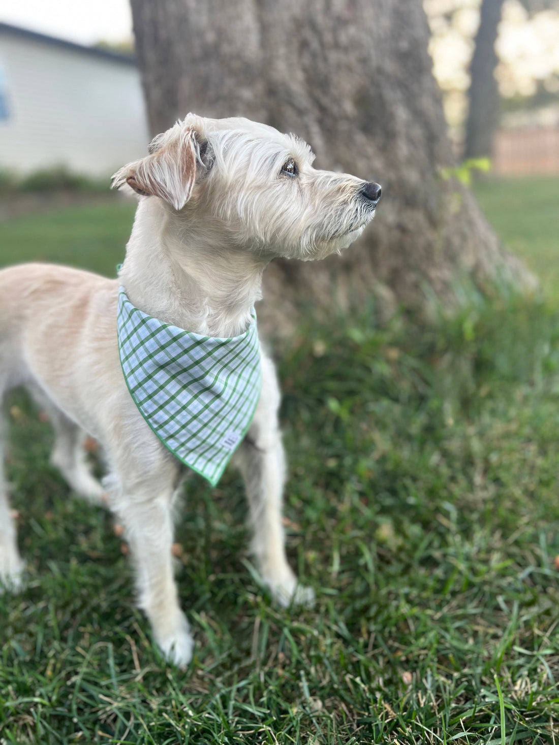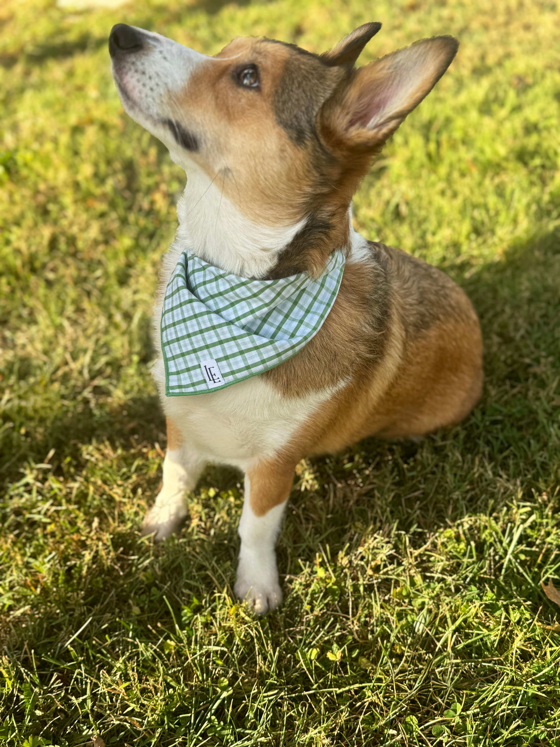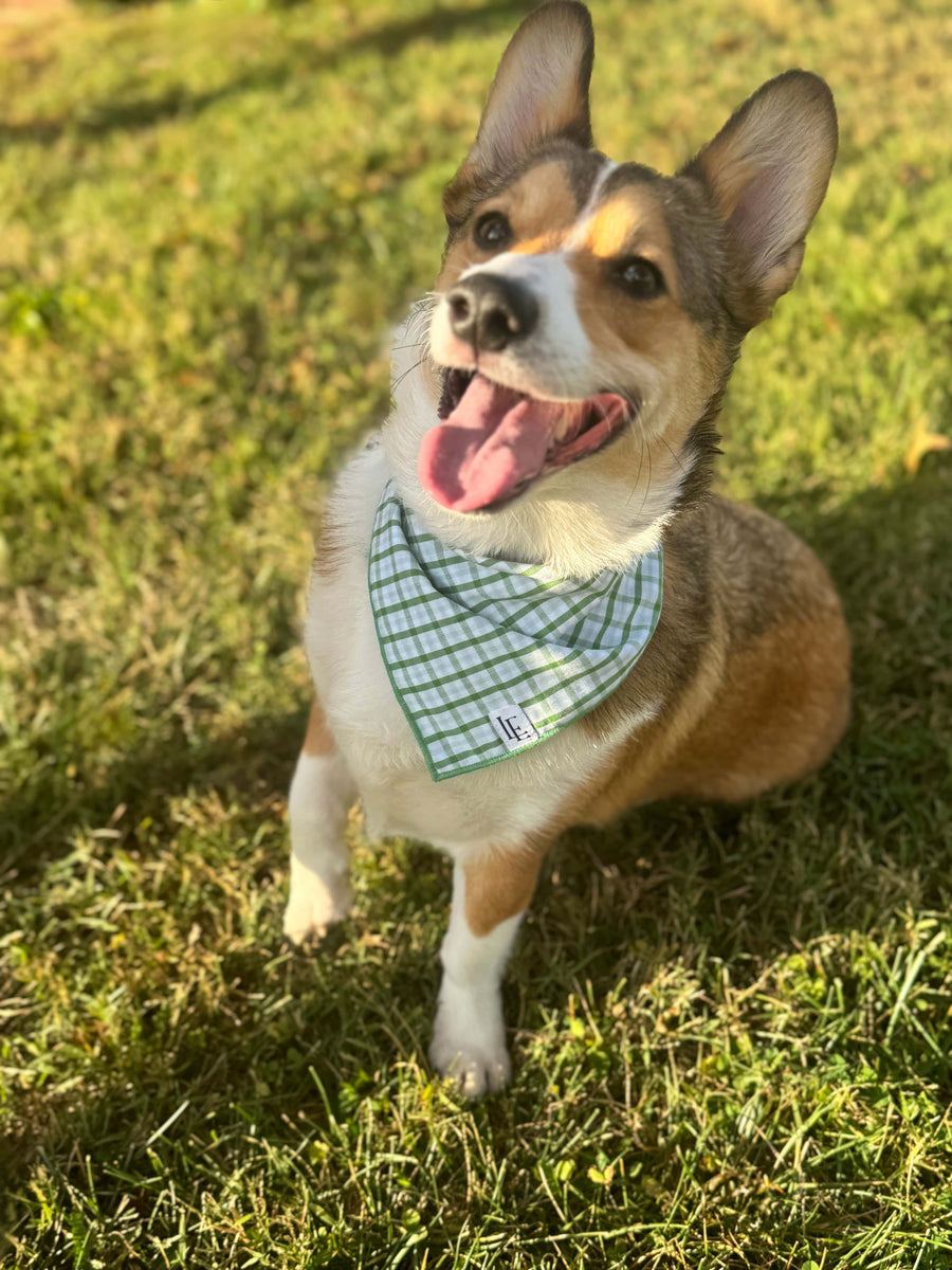 Little English traditional children's clothing. Green plaid dog bandana for Fall