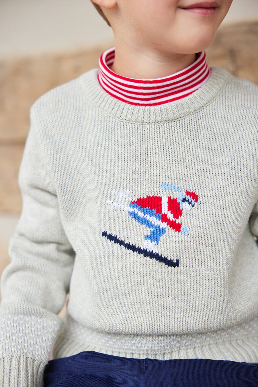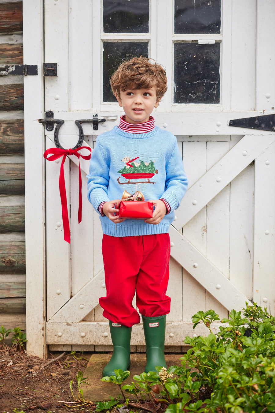 Little English boy's outfit for the holidays, red striped long sleeve turtleneck with nutcracker sweater and red corduroy pants