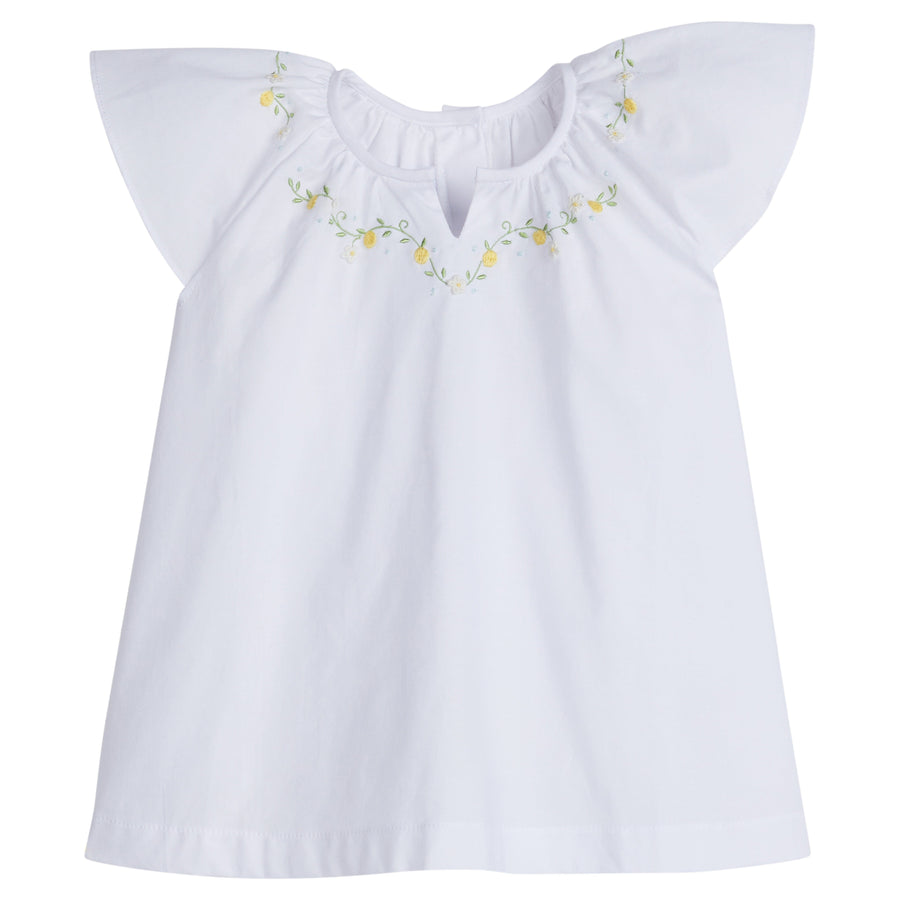 When life gives you lemons, wear them! Our Embroidered Blouse features angel sleeves with a tiny V at the neck and a chain of yellow lemons and white flower embroidery. Pair it with our Scallop Short in Island Stripe Seersucker to complete the look and sibling matching is easy peasy lemon squeezy with other pieces from our Main Squeeze Collection.