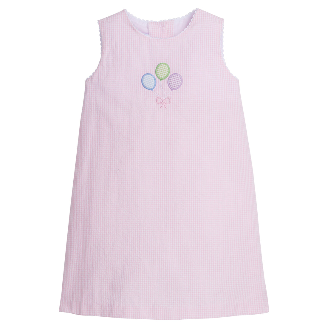 What better way to celebrate than with classic balloon appliques? This sleeveless shift dress is made from our light pink mini seersucker gingham fabric and features three adorable gingham balloon appliques at the center of the chest.  White ric-rac detailing at the sleeves and neck adds that something extra! From birthdays to baby showers and everything in between, these sweet styles are an easy fit for any special occasion.