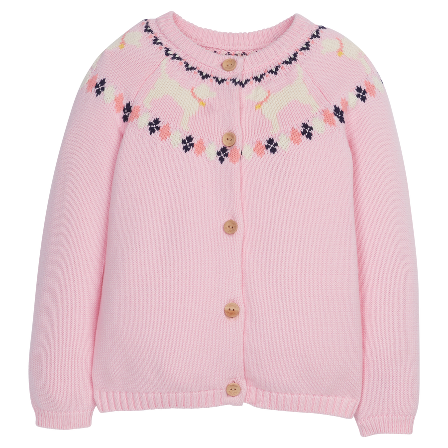 Fügen Sie Schichten im klassischen LE-Stil hinzu! Dieser Fair-Isle-Cardigan hat ein Argyle-Muster und Labradore, die den Kragen umkreisen , auf einem hellrosa Hintergrund. Brother kann dazu unseren hellblauen Boy-Lab-Fair-Isle-Cardigan tragen. Vervollständigen Sie den Look mit unserem charakteristischen bedruckten Rollkragenpullover – Girl Lab und Jakobsmuschel-Shorts aus marineblauem Cord.