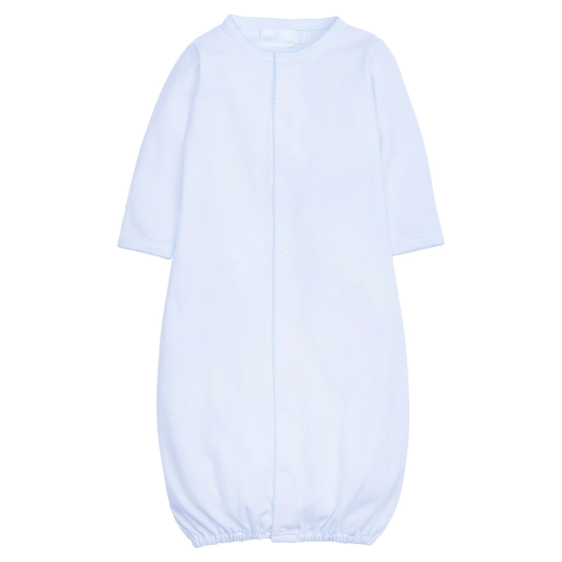 Kleiden Sie Ihren Kleinsten in unsere traditionellen Neugeborenenkleider! Dieses klassische Babykleid aus weichster Pima-Baumwolle hat unsere charakteristischen hellblauen Streifen, einen hellblauen Picotbesatz und Druckknöpfe auf der Vorderseite für schnelles und einfaches Anziehen. Einfach perfekt zum Kuscheln mit dem Baby!