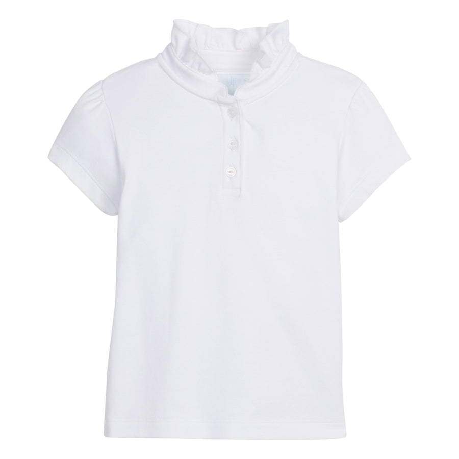 The Hastings Polo in White will be a much loved staple in your daughter's closet - for school and play! This polo shirt features a ruffled neckline and puffed sleeves with a two button closure down the front. It's classic yet modern and oh-so-sweet!