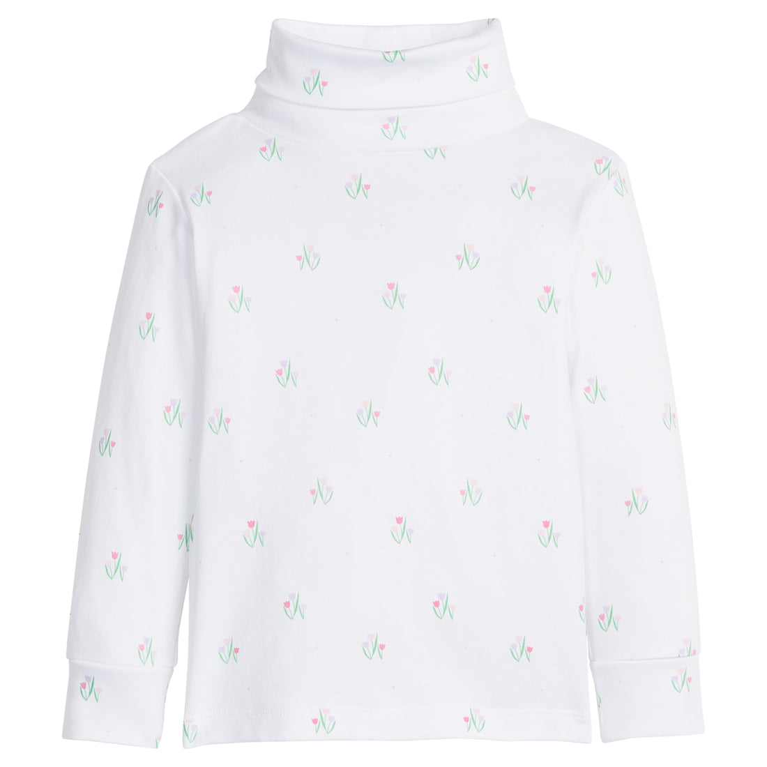 This signature Little English printed turtleneck features a white 100% Pima cotton base with an adorable print of pink and lavender tulips. Pair with our Kick Flare Leggings in Hot Pink and layer with our Embroidered Cardigan - Tulips for the cutest Fall look!